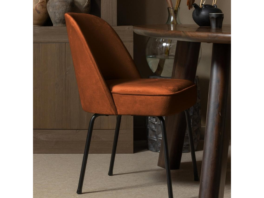 Židle Tergi je působivou židlí v moderním stylu se sametovým čalouněným sedákem cihlově červené barvy a černě lakovanou kovovou podnoží. Kombinace kvalitní potahové látky, která je velmi příjemná na dotek, a stabilní podnože tvoří velmi atraktivní spojení, které zaujme nejen na pohled, ale také svým komfortem. Židle Tergi zútulní váš interiér a dodá mu nadčasový design a osobitou atmosféru.