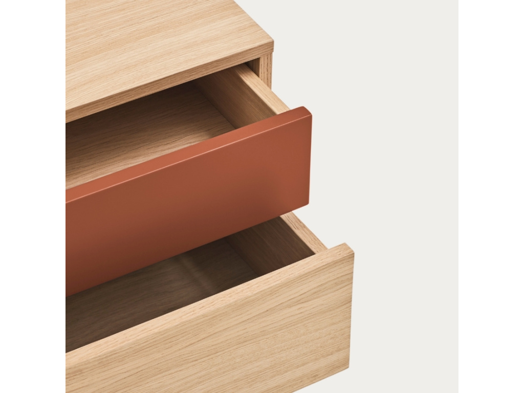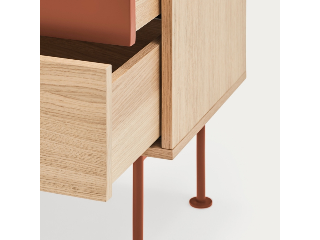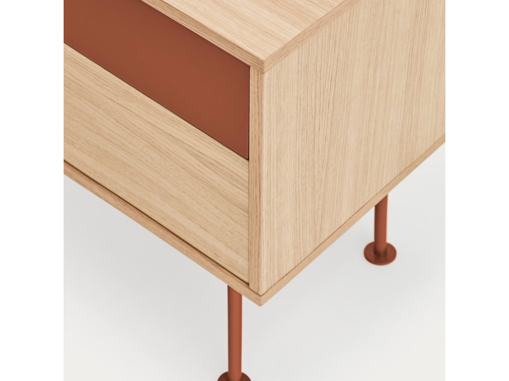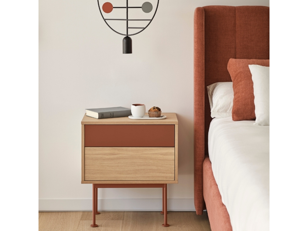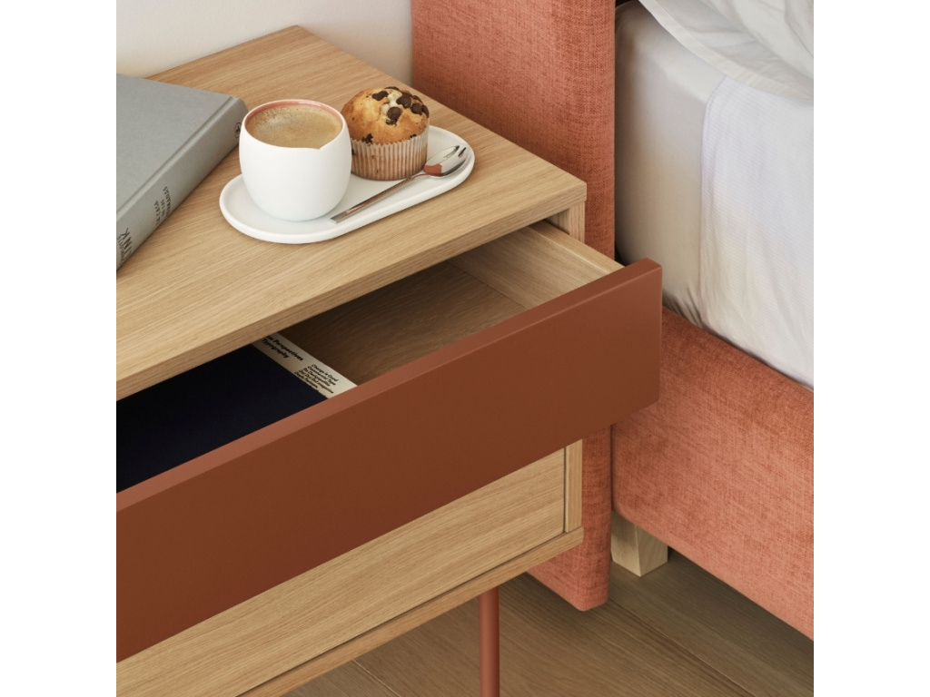 Stylový noční stolek Teulat Yoko zaujme na první pohled svým neobyčejným designem. Kombinace korpusu z dubové dýhy, 1. zásuvky z lakované MDF v cihlově červené barvě a kovové podnože ve stejné barvě vnese do vašeho interiéru moderní a trendy prvek. Stolek disponuje prostornými zásuvkami, které vytváří praktické a prostorné úložiště, kam pohodlně uložíte váš inventář. Stolek se skvěle hodí do moderních interiérů. Doporučujeme kombinovat s dalšími produkty z řady Yoko.