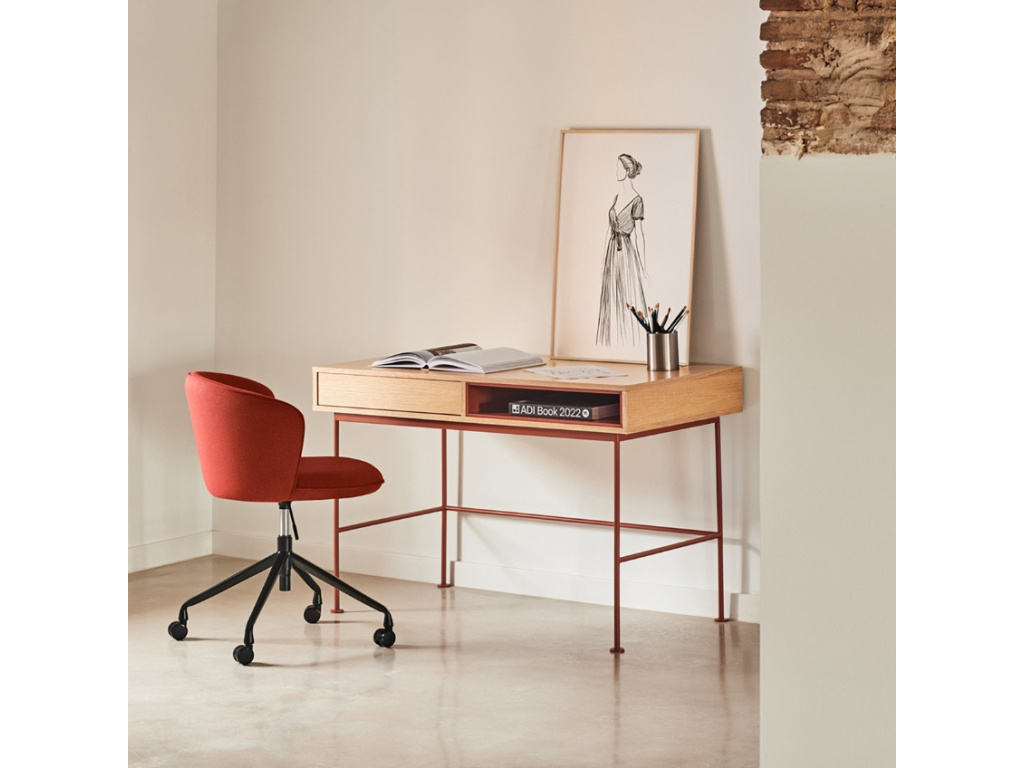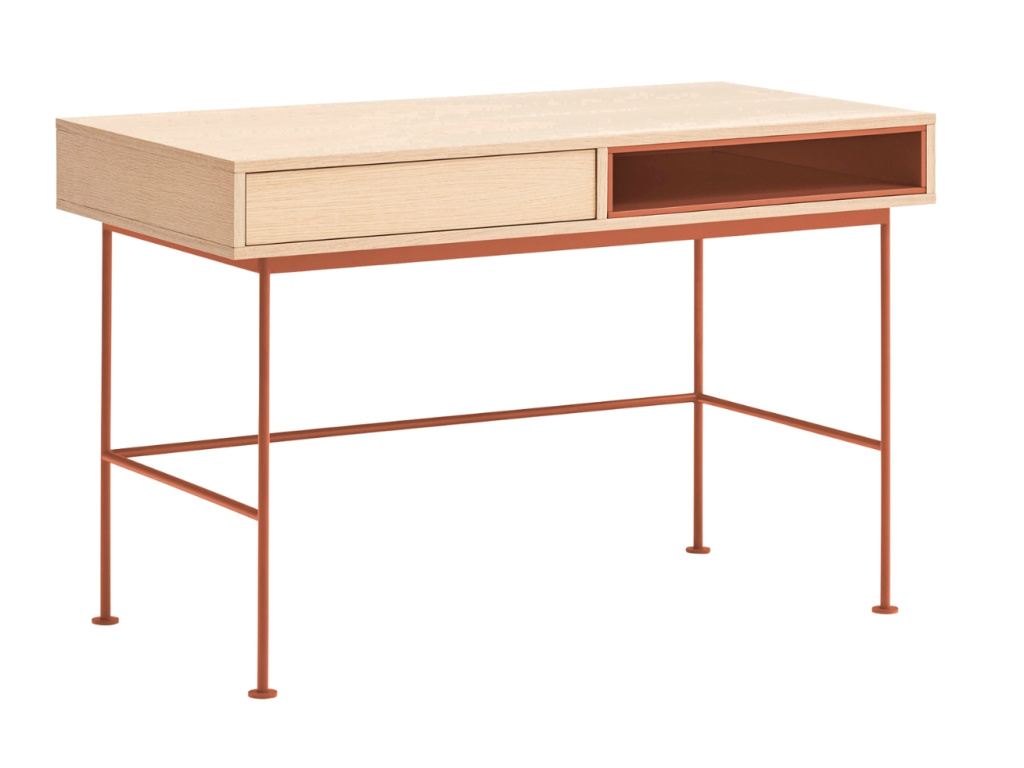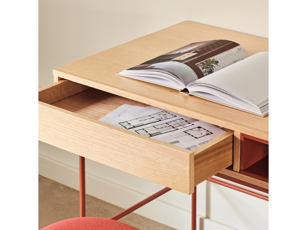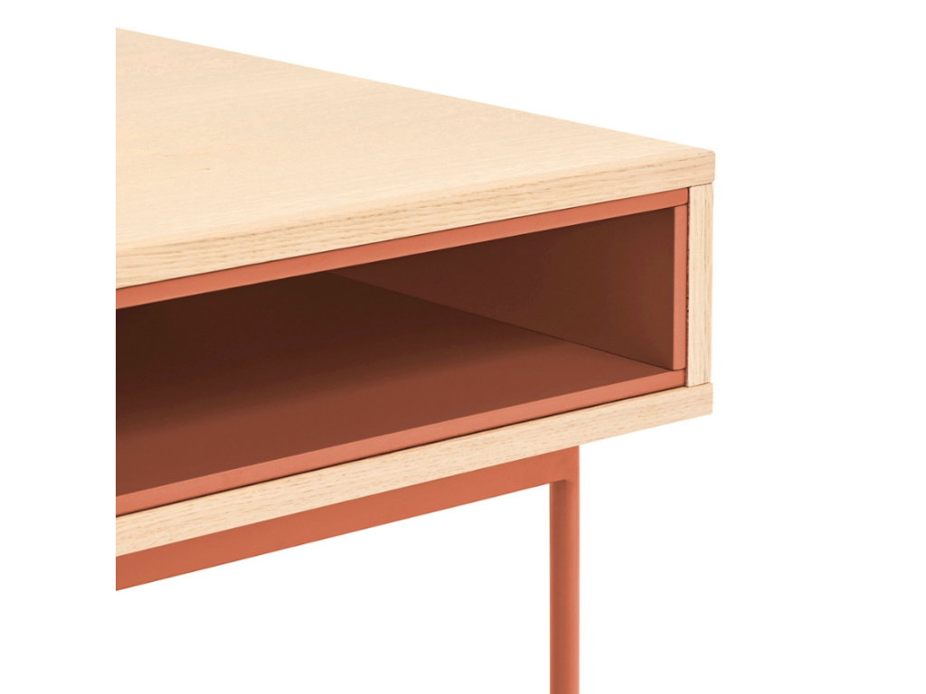 Stylový pracovní stůl Teulat Yoko zaujme na první pohled svým neobyčejným designem. Kombinace korpusu z dubové dýhy, vnitřku z lakované MDF v cihlově červené barvě a kovové podnože ve stejném odstínu vnese do vašeho interiéru moderní a trendy prvek. Stolek disponuje úložným prostorem v podobě otevřené police a zásuvky, kam pohodlně uložíte dokumenty i psací potřeby. Doporučujeme kombinovat s dalšími produkty z řady Yoko a docílit tak dokonale sladěného prostoru.