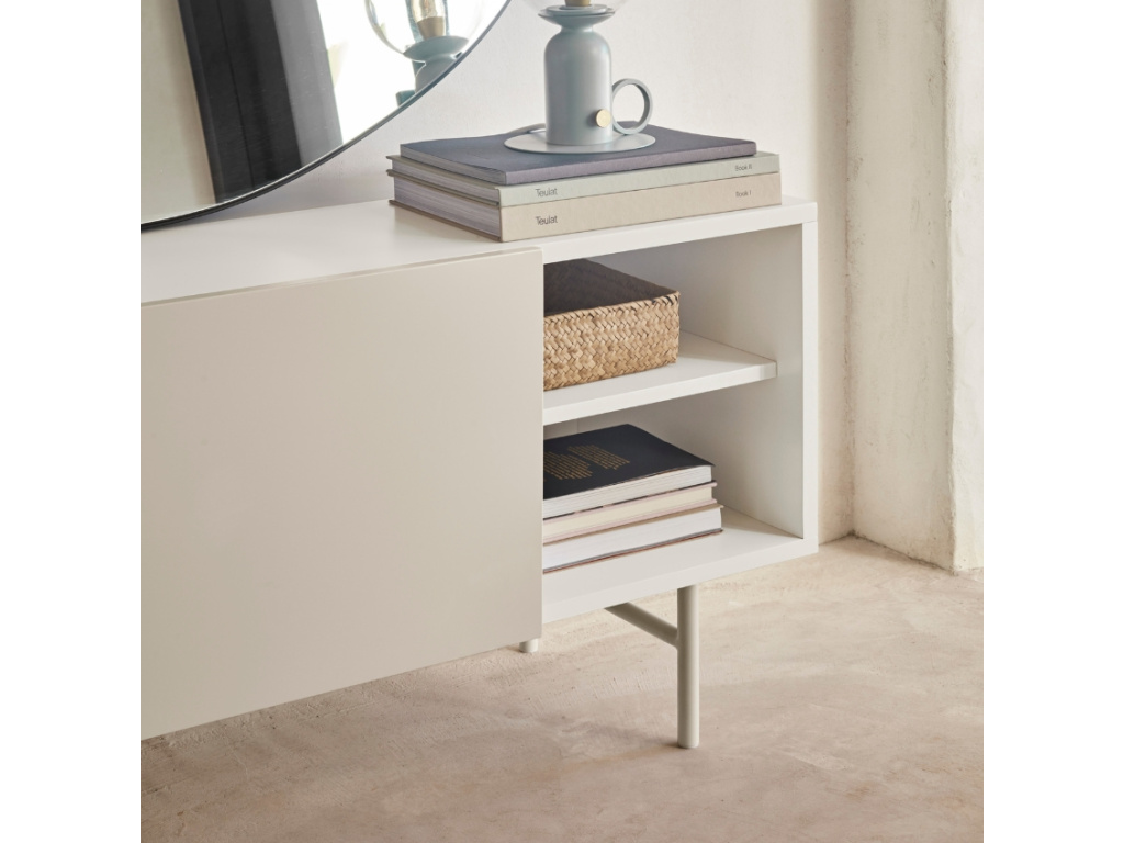 Využijte prostor pod televizí chytře a efektivně. Minimalistický TV stolek Nube od španělské značky Teulat vám poskytne elegantní a praktický úložný prostor. Designový TV stolek v cihlově červené a béžové barvě disponuje 2 šuplíky, 1 policí skrytou za dvířky a 2 policemi, které můžete zakrýt posuvnými dveřmi. Oceníte jistě také praktické výkroje v zadní desce pro snadné zapojení vašich multimediálních přehrávačů a herních konzolí. Díky bezúchytkovému provedení vyniknou jednoduché a čisté linie TV stolku. Praktický systém Push to open zajišťuje snadné otevírání zásuvek a dvířek i bez úchytek. Použité lakované MDF zaručuje snadnou údržbu a vysokou odolnost. TV stolek nabízíme ve třech barevných provedeních.