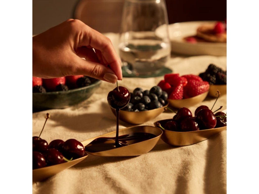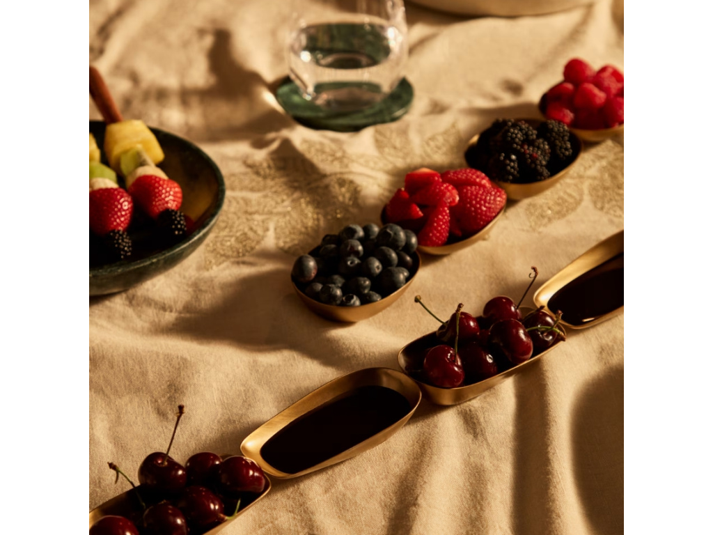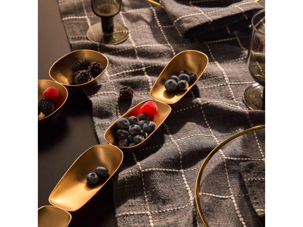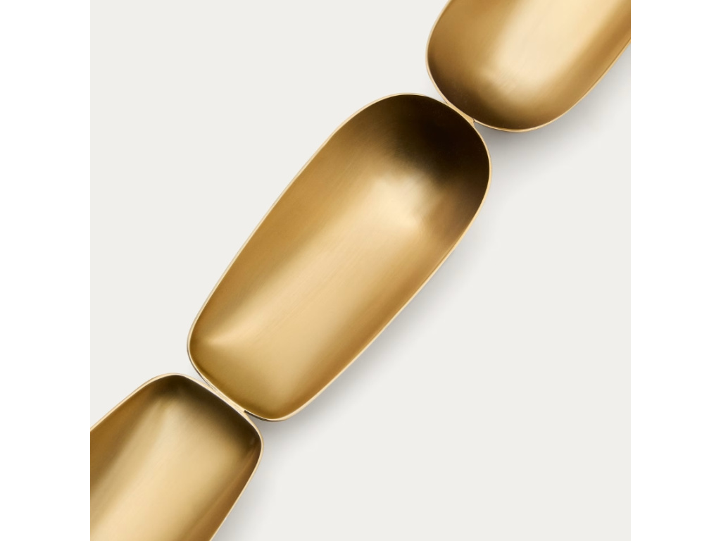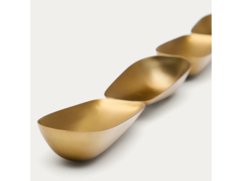 Série kuchyňských pomůcek a doplňků Aruc od značky Kave Home přinese na váš stůl dotek zlaté elegance. Patří do ní také praktická čtyřdílná miska, která se skvěle hodí k pohoštění vašich návštěv - naservírovat do ní můžete například pomazánky a dipy, nebo také oříšky, semínka a jiné pochutiny. Na stole ji může doplnit třeba dvoupatrový etažér, chladící nádoba a set táců – vše dokonale sladěné.