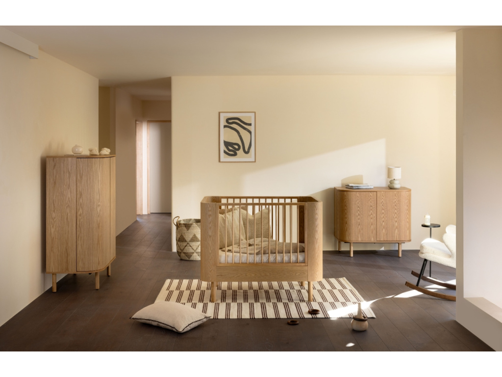 Kolekce nábytku Quax Yume představuje nadčasový design s jemnými křivkami a pyšní se jak estetickou, tak praktickou funkcí. Dětská postýlka v minimalistickém designu je vyrobena z jasanové dýhy a doplňuje ji masivní podnož a bočnice s lištami z jasanového dřeva. Vylaďte interiér k dokonalosti s dalšími kousky z této kolekce, či z oblíbené kolekce Hai-No-Ki, které spolu skvěle ladí nejen stejným povrchem.