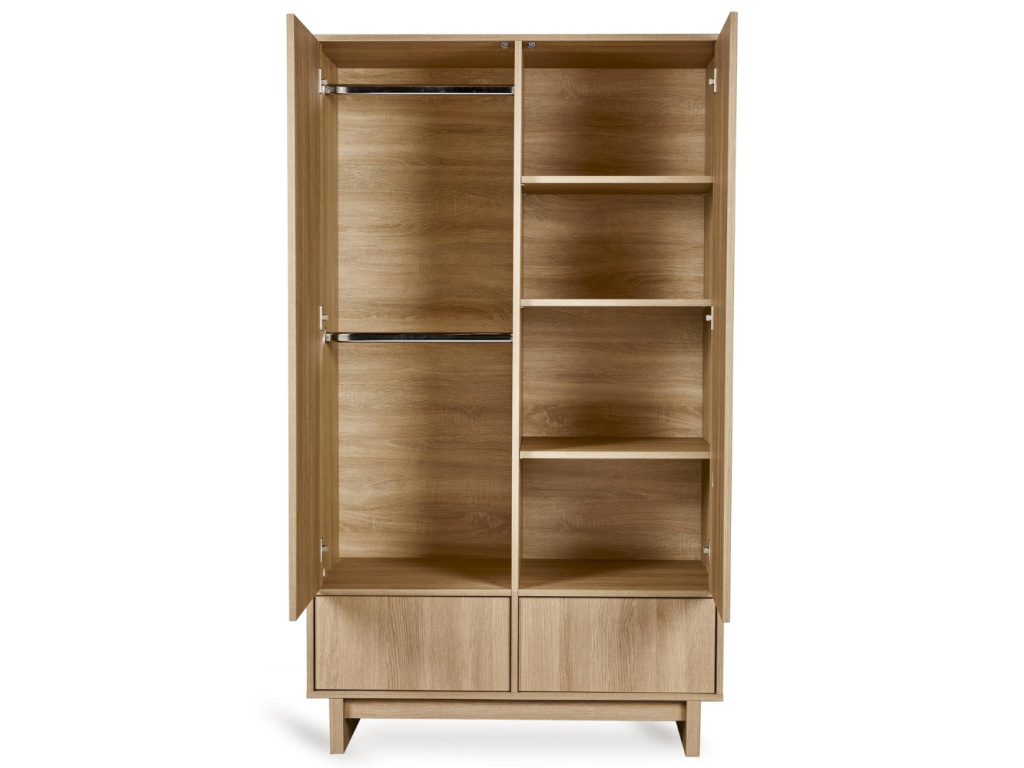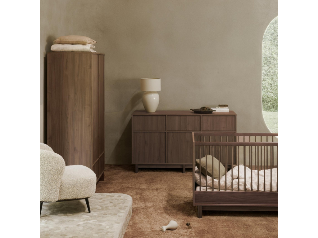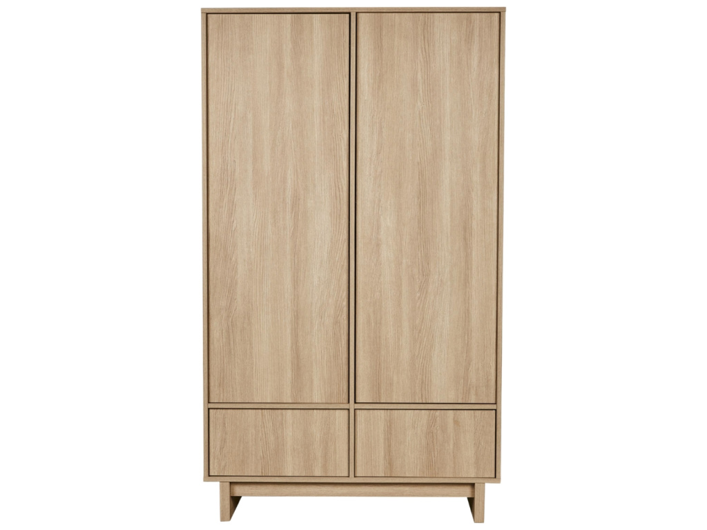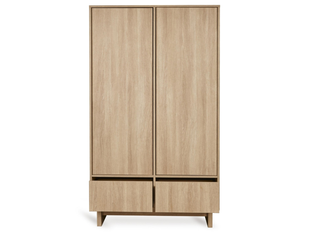 Klíčovou vlastností kolekce Kyo je univerzálnost, která se odráží i v designu této dvoudveřové šatní skříně. Uvnitř se skrývá promyšlený prostor se třemi nastavitelnými policemi, dvěma závěsnými tyčemi a dvojicí prostorných zásuvek pro maximální přehled. Na první pohled nenápadný systém otvírání push-to-open definuje celkový vzhled, který se nese v minimalistickém duchu. Díky hřejivému dekoru jasanového dřeva se hodí do každého dětského pokojíčku, ložnice i do obývacího pokoje. Kolekce Kyo nabízí širokou škálu prvků, které k sobě přirozeně ladí a vybízejí ke vzájemné kombinaci pro dokonale sladěný interiér.