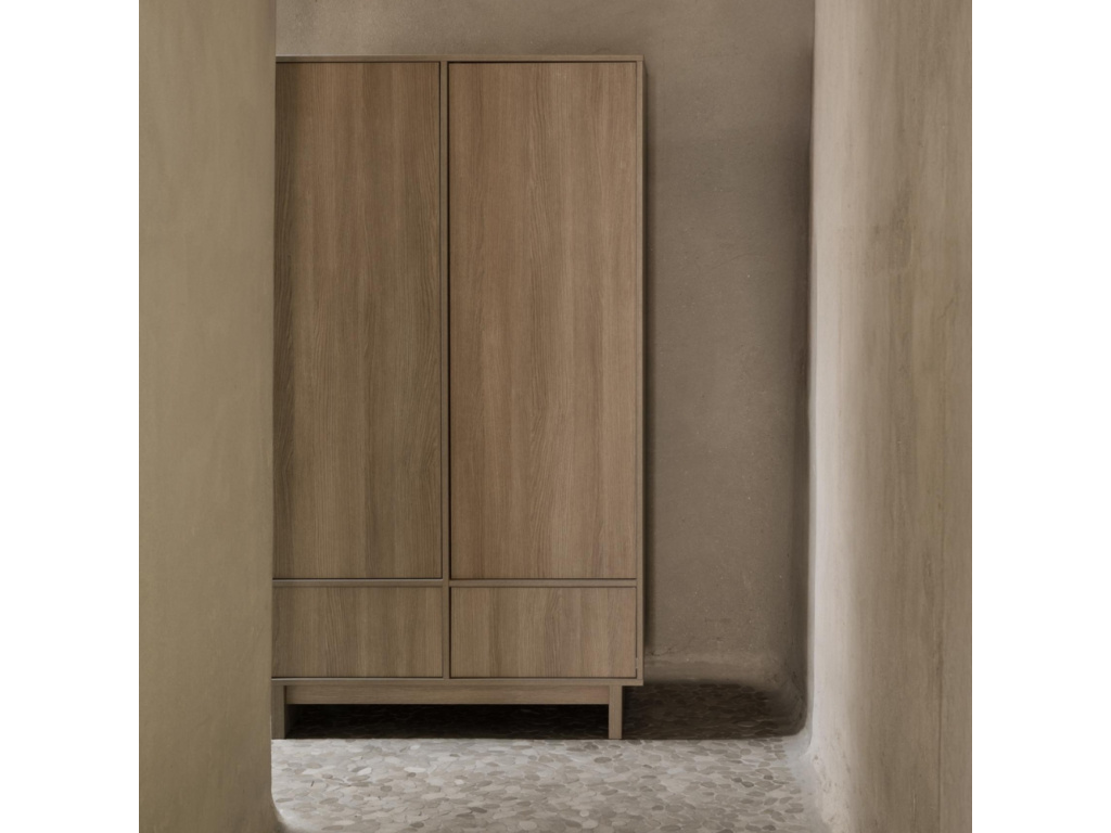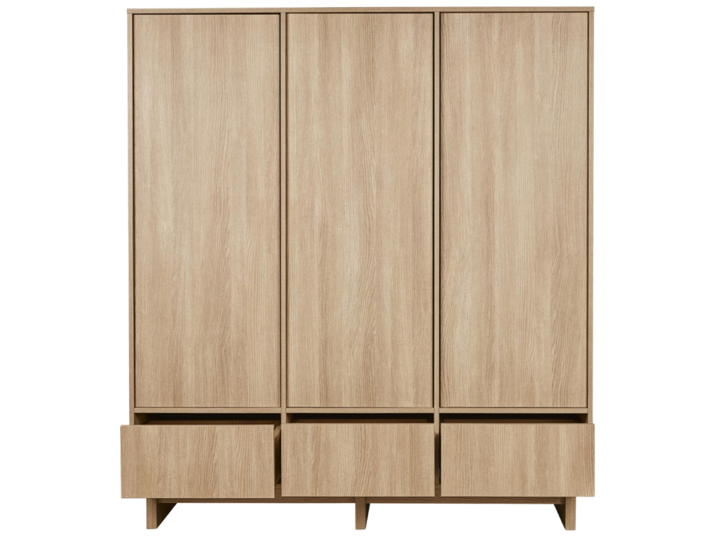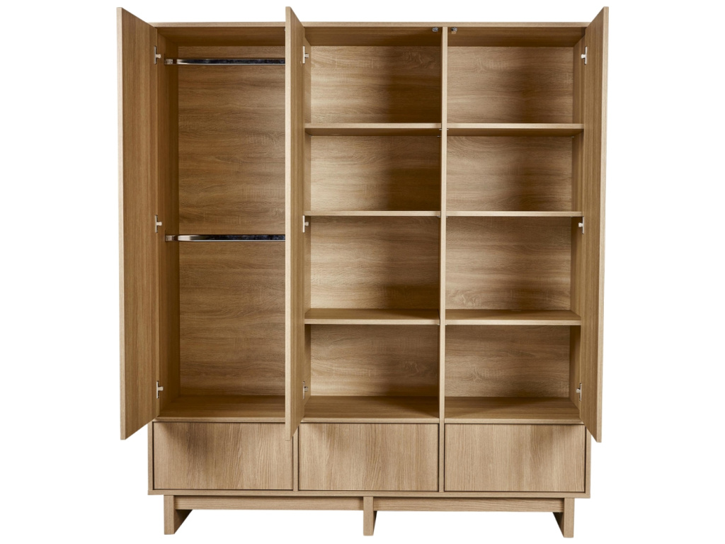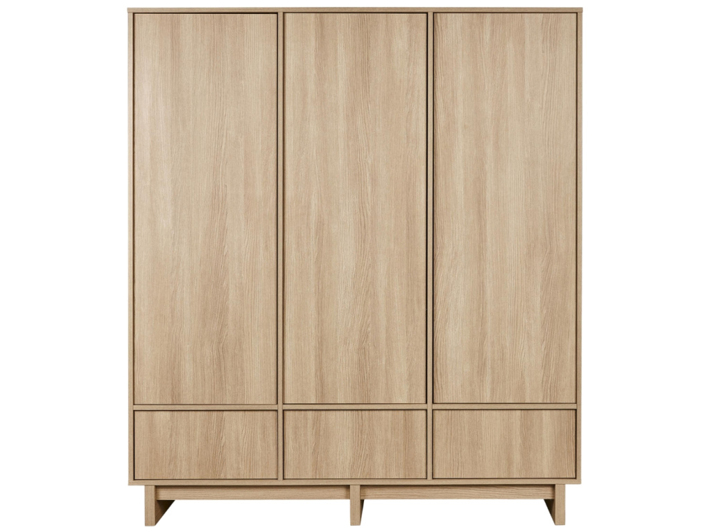 Klíčovou vlastností kolekce Kyo je univerzálnost, která se odráží i v designu této třídveřové šatní skříně. Uvnitř se skrývá promyšlený prostor se šestmi nastavitelnými policemi, dvěma závěsnými tyčemi a trojicí prostorných zásuvek pro maximální přehled. Na první pohled nenápadný systém otvírání push-to-open definuje celkový vzhled, který se nese v minimalistickém duchu. Díky hřejivému dekoru jasanového dřeva se hodí do každého dětského pokojíčku, ložnice i do obývacího pokoje. Kolekce Kyo nabízí širokou škálu prvků, které k sobě přirozeně ladí a vybízejí ke vzájemné kombinaci pro dokonale sladěný interiér.
