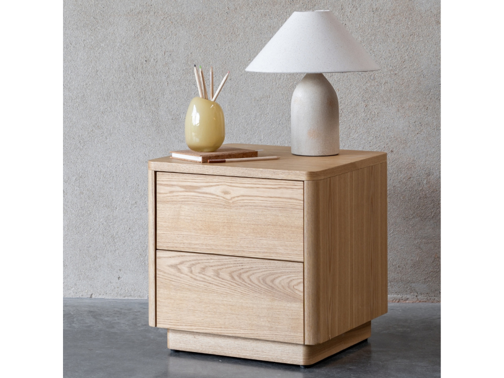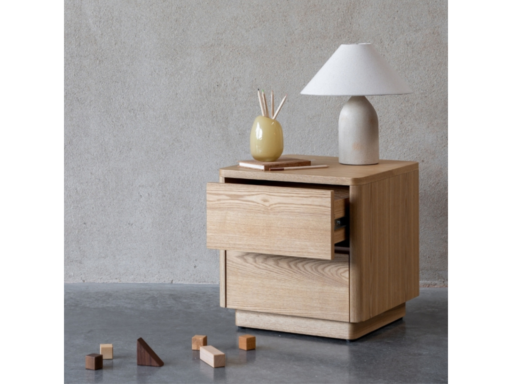 Tento noční stolek s dvěma zásuvkami vnese do dětského pokojíčku klidnou estetiku ikonické kolekce Yumi od značky Quax. Povrch stolku tvoří dýhovaná MDF deska – tedy materiál, který vypadá jako masivní dřevo, ale je cenově dostupnější, tvarově stálý a méně náchylný k praskání nebo kroucení. Teplý jasanový odstín a jemné křivky dodávají nábytku přirozený, harmonický výraz. Vylaďte interiér k dokonalosti s dalšími kousky z této kolekce, či z oblíbené kolekce Hai-No-Ki, které spolu skvěle ladí nejen stejným povrchem.