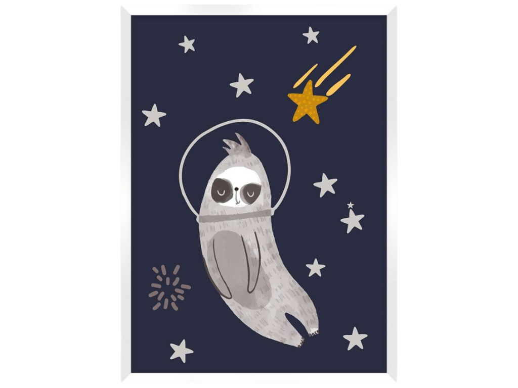 Obraz Happy Sloth svým kouzelným designem zútulní jakýkoliv pokojíček, a vykouzlí úsměv na tváři všem dětským dušičkám. Najdete na něm šedého lenochoda v kosmonautské helmě, jak poletuje mezi hvězdičkami. Bude tedy ideálním doplňkem pro všechny malé dobrodruhy, kteří milují vesmír. Díky neutrálním barvám obrázku s ním hravě sladíte ostatní doplňky v dětském pokoji, a skvěle bude vypadat i v kombinaci s ostatními obrazy od značky Yellow Tipi.