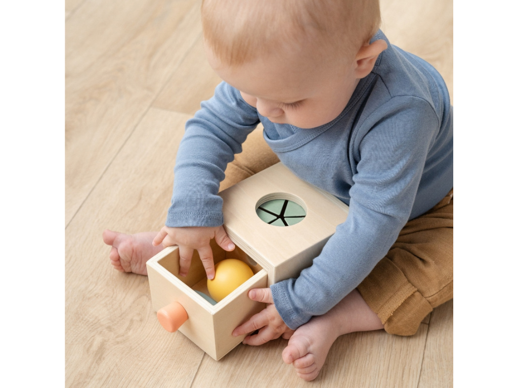 Dřevěná kostka Nozo od Done by Deer zabaví vaše děťátko oblíbenou hrou na schovávání a hledání. Pomůže procvičovat jemnou motoriku, logické myšlení a koordinaci ruka-oko. Hračka obsahuje dřevěnou kostku se šuplíčkem a otvory, míček s chrastítkem uvnitř, figurku nosorožce Noza a kulatý blok s kontrastními puntíky. Veselé barvy a různorodé tvary zaujmou drobečka a budou zároveň rozvíjet jeho představivost.