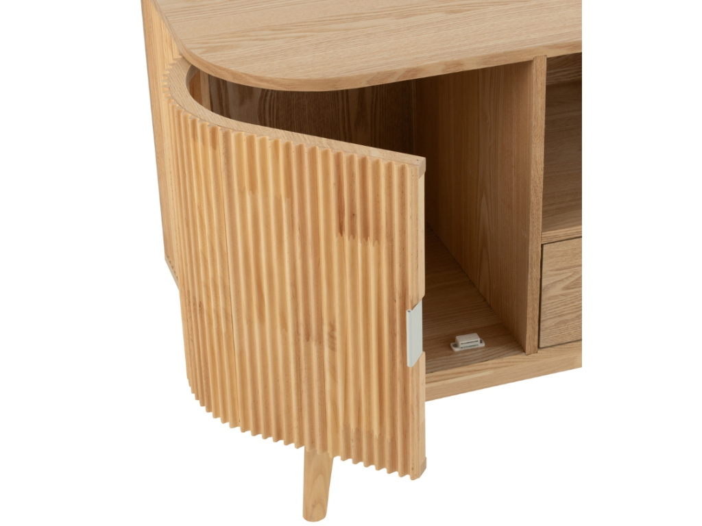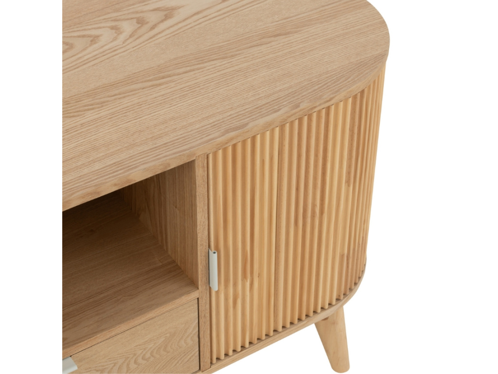 Elegantní komoda Rounded je dokonalým propojením funkčnosti a estetiky. Dvířka s jemným svislým drážkováním dodávají moderní šmrnc a zároveň opticky zjemňují celkový vzhled. Praktické členění úložného prostoru zahrnuje dvě skříňky, zásuvku a otevřenou polici, takže vše budete mít přehledně po ruce. Přírodní provedení vnese do interiéru hřejivou atmosféru a útulnost, zatímco čisté linie podpoří harmonii místnosti. Skvěle zapadne do obýváku, jídelny i ložnice a snadno se sladí s dalšími kousky nábytku.