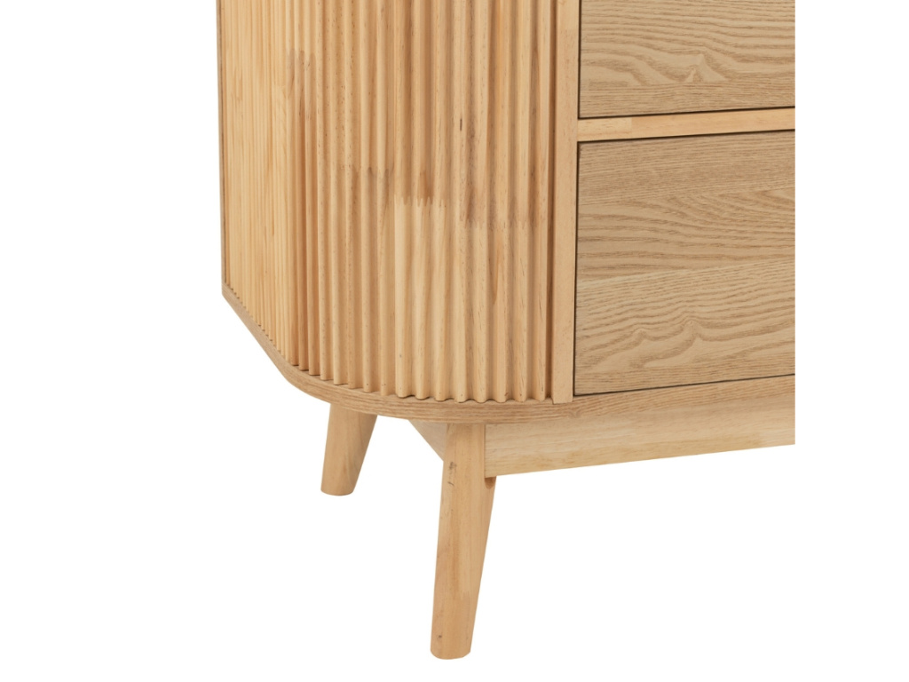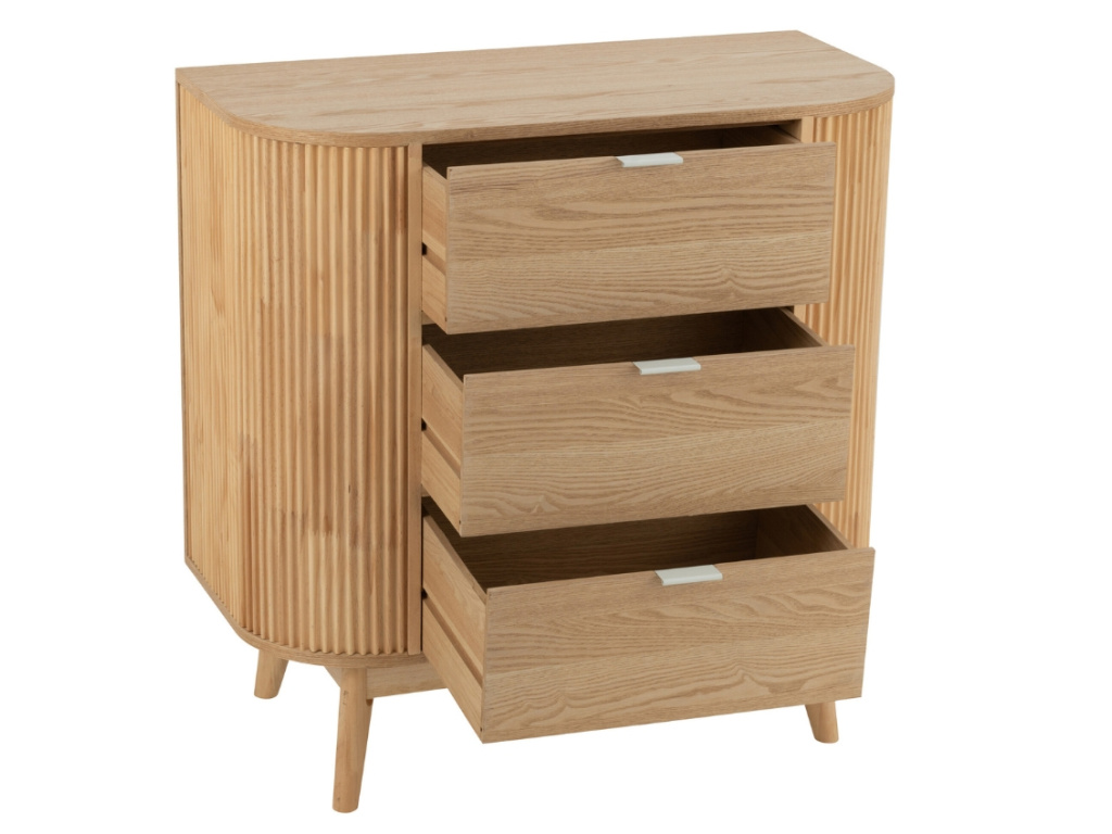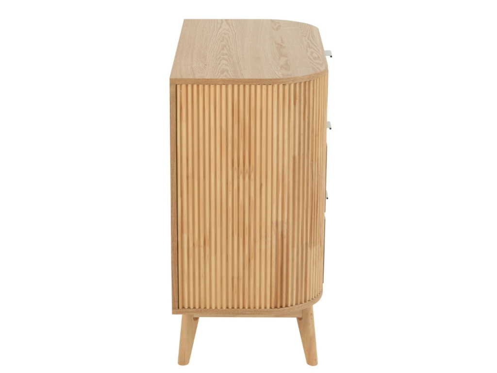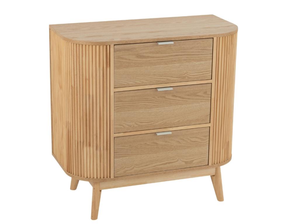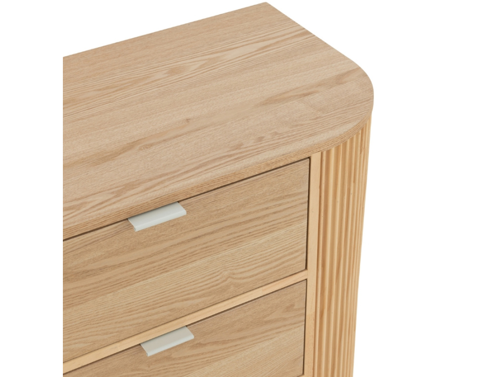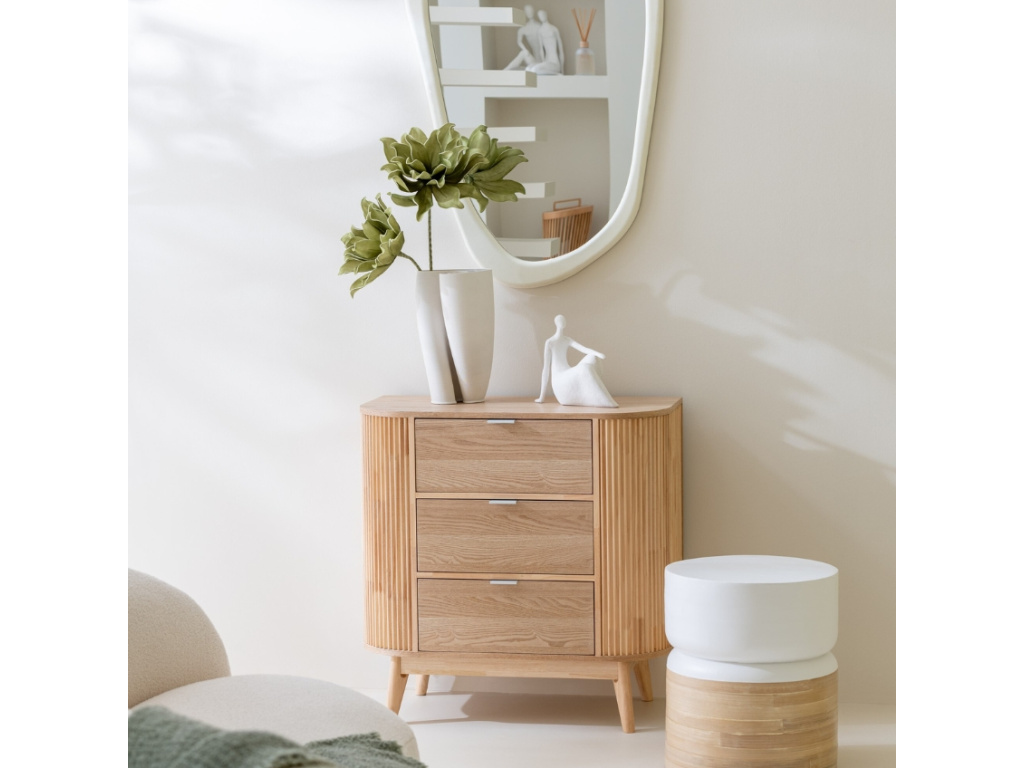 Komoda Rounded přináší do interiéru hřejivé přírodní dřevo a nadčasovou eleganci. Její zaoblené rohy a vertikálně frézované boky jí dodávají jemný, ale zároveň výrazný vzhled, který zaujme na první pohled. Tři prostorné zásuvky poskytují dostatek úložného prostoru na oblečení, dokumenty či drobnosti každodenní potřeby. Minimalistické kovové úchytky podtrhují moderní design. Díky svému čistému vzhledu se komoda hodí jak do ložnice, tak do obývacího pokoje nebo předsíně. Tento kousek je ideální volbou pro ty, kteří chtějí skloubit praktickou funkci s estetickým dojmem. Krásně vynikne i jako samostatný solitér v moderním i přírodně laděném interiéru.