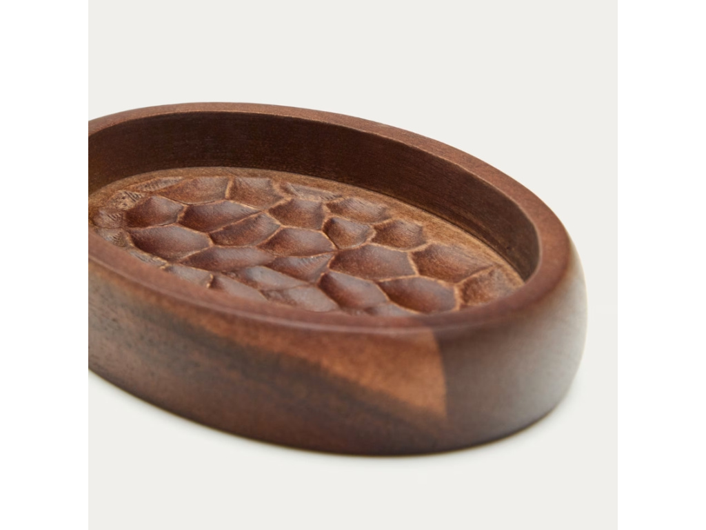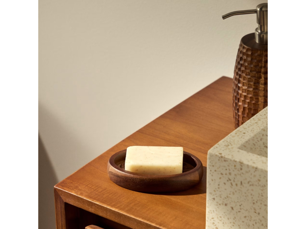 Fraz je série koupelnových doplňků, která přináší do vašeho interiéru krásu masivního dřeva a poctivost materiálu. Vyrobená z akátového dřeva s FSC certifikací, vyniká svou jemnou kresbou, teplým odstínem a nadčasovým designem, který se hodí do moderní i přírodně laděné koupelny. Série zahrnuje misku na mýdlo, dávkovač na tekuté mýdlo a stojan na zubní kartáčky – každý kus lze kombinovat do harmonického celku, který působí klidně a přirozeně. Skvěle vynikne samostatně, ale v sadě získá koupelna jednotný a stylový vzhled.