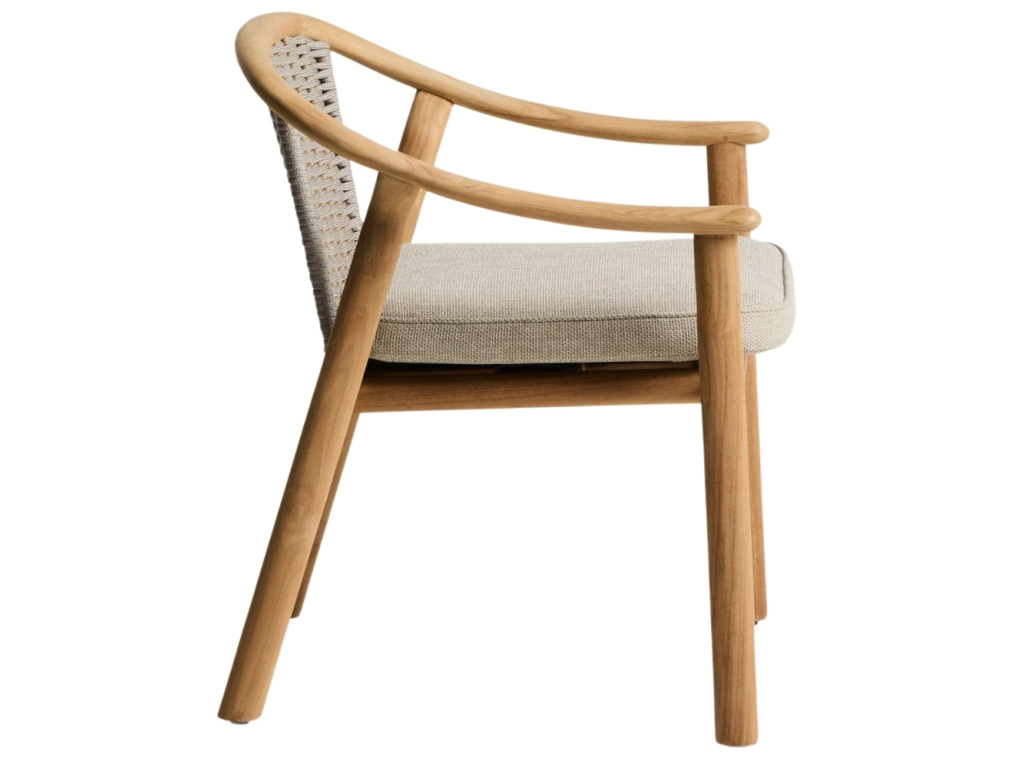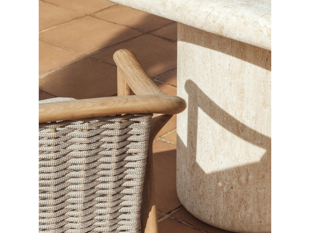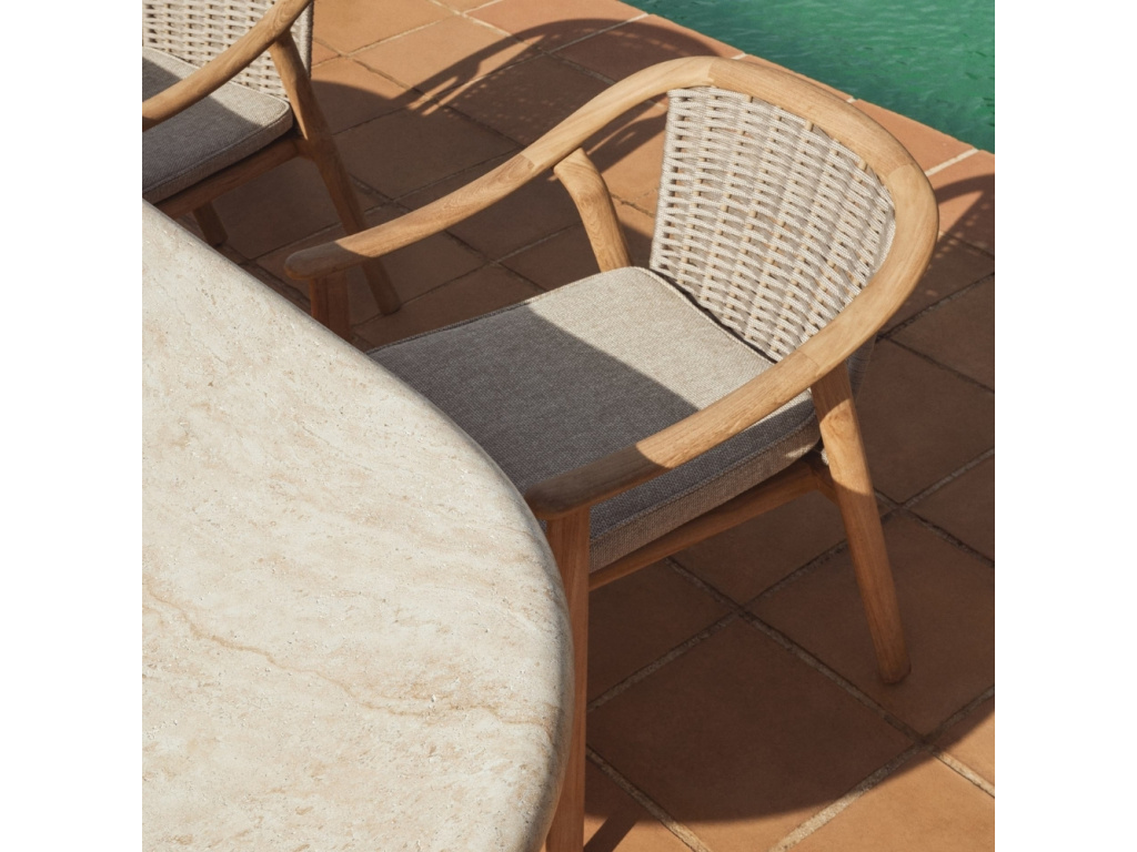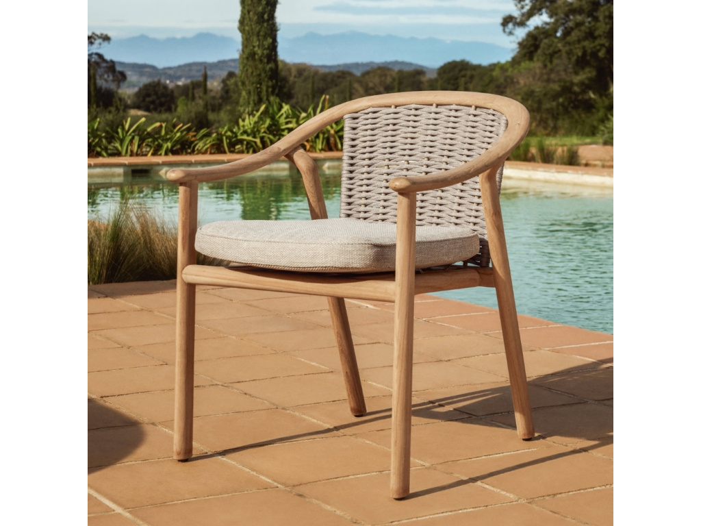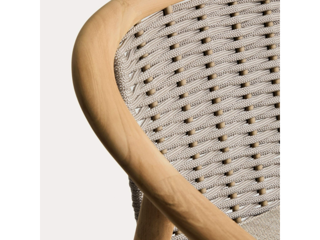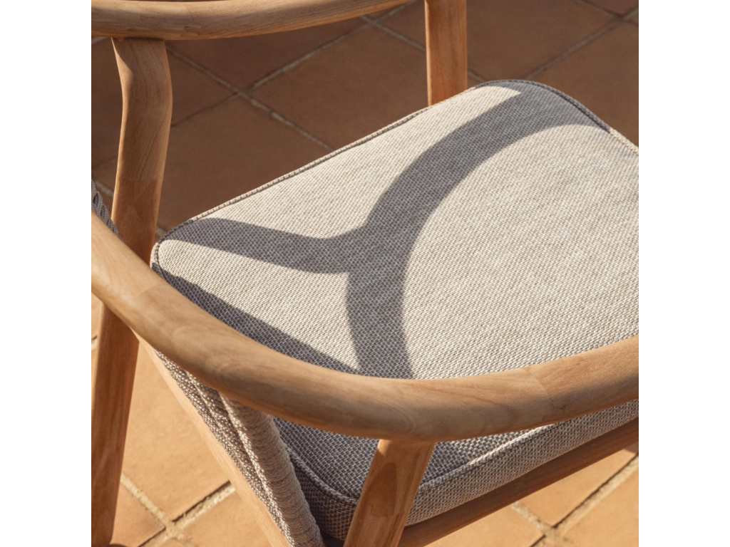 Zahradní židle Elunda spojuje přirozenou krásu masivního teakového dřeva s lehkostí ručně tkaného výpletu. Každý kus nese jedinečnou kresbu dřeva, která dodává prostoru autentický a hřejivý charakter. Opěradlo z ručně vyplétaného lana odolného vůči UV záření poskytuje pohodlnou oporu a zároveň přináší jemnou texturu a vzdušnost. Podsedák s odnímatelným potahem je vyrobený z retikulované pěny, která umožňuje průchod vody a podporuje rychlé schnutí. Elunda je navržena pro vytvoření útulných a harmonických venkovních prostor – doplnit ji můžete také křesly nebo pohovkami ze stejnojmenné série.