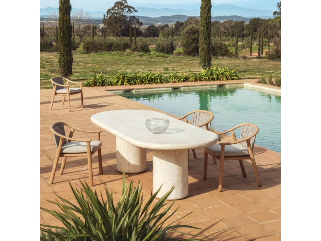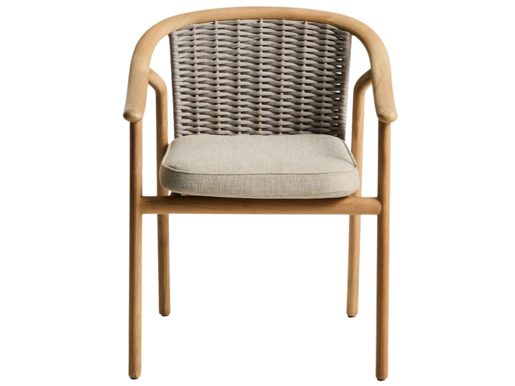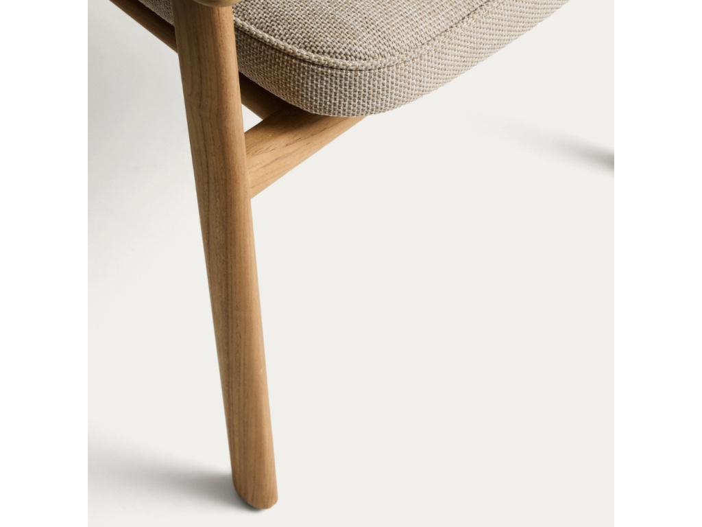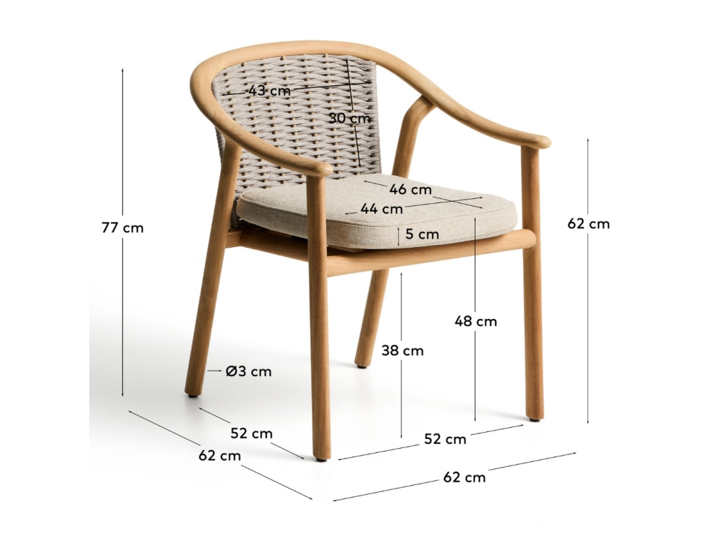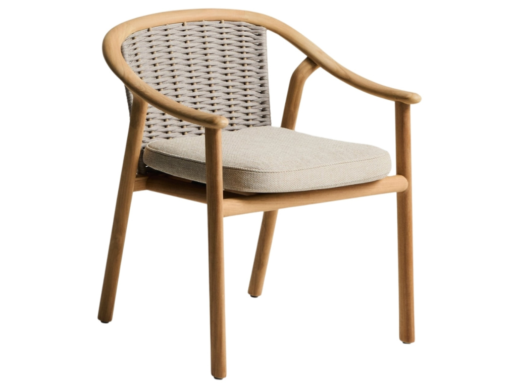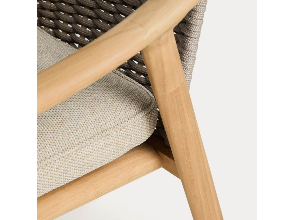 Zahradní židle Elunda spojuje přirozenou krásu masivního teakového dřeva s lehkostí ručně tkaného výpletu. Každý kus nese jedinečnou kresbu dřeva, která dodává prostoru autentický a hřejivý charakter. Opěradlo z ručně vyplétaného lana odolného vůči UV záření poskytuje pohodlnou oporu a zároveň přináší jemnou texturu a vzdušnost. Podsedák s odnímatelným potahem je vyrobený z retikulované pěny, která umožňuje průchod vody a podporuje rychlé schnutí. Elunda je navržena pro vytvoření útulných a harmonických venkovních prostor – doplnit ji můžete také křesly nebo pohovkami ze stejnojmenné série.