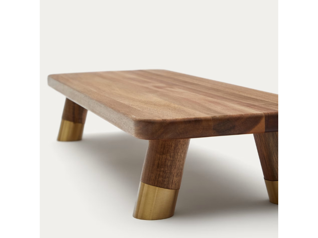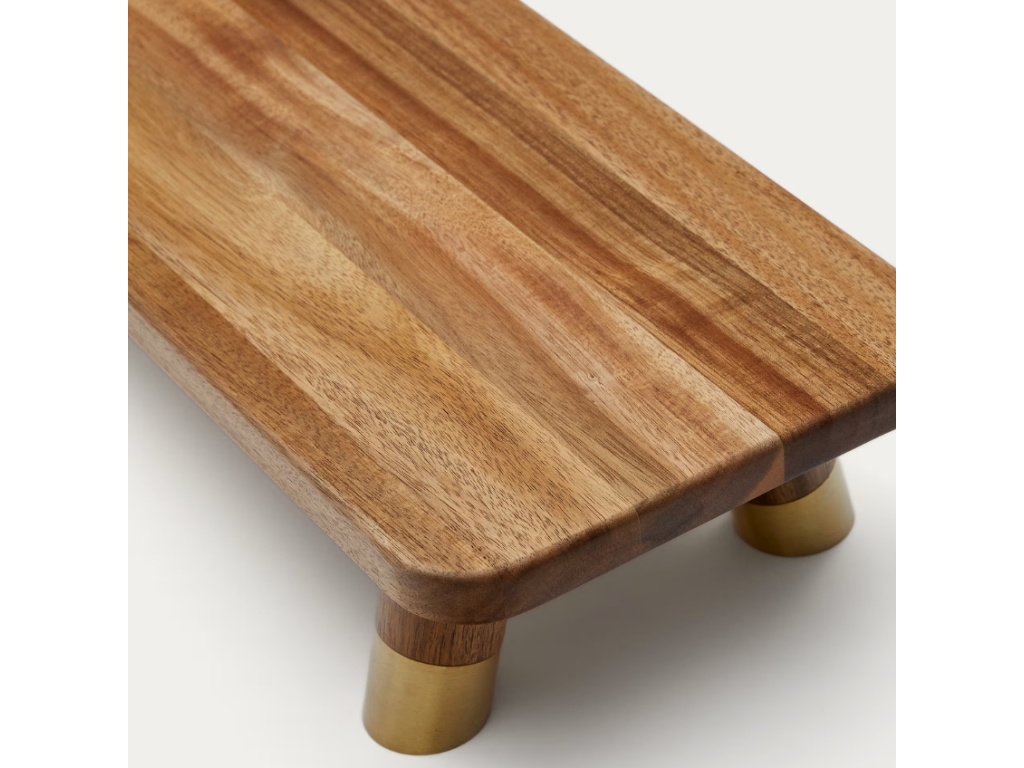 Servírovací prkénko Sataya pochází ze série kuchyňských pomůcek značky Kave Home, vyrobených z akátového dřeva. To je vkusně doplněno zlatě lakovaným kovovými detaily, díky které pomůcky získávají na zajímavosti a originalitě. Vybavte vaši kuchyň těmito elegantními kousky – zútulní jí a pomůžou vám s každodenním vařením a servírováním. Prkénko je navíc dostupné ve dvou velikostech, které budou vypadat skvěle pospolu. Naservírovat na ně můžete třeba sýry. uzeniny nebo drobné dezerty.