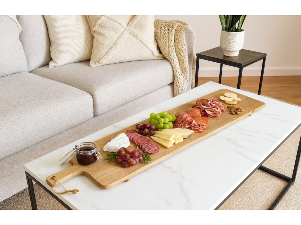 Dřevěné servírovací prkénko Oolong od značky J-line zaujme svým atypicky dlouhým rozměrem a jasně patrnou kresbou dřeva. Jeho deska je lehce vyvýšená na nízkých podnožkách, což mu dodává elegantní vzhled, ideální pro stylové servírování tapas nebo jiných drobných pokrmů – a to i pro větší skupinu hostů. Díky praktickému poutku je snadné jej zavěsit. Může sloužit nejen jako prkénko, ale i jako originální podnos pro vystavení dekorací. Perfektně zapadne do interiérů ve stylu japandi, kde může sloužit i jako alternativní stolek.