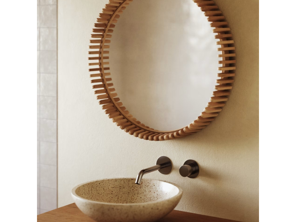 Kulaté zrcadlo Kave Home Polke zaujme svým originálně tvarovaným rámem tvořeným kousky teakového dřeva – skvěle se tak hodí do přírodně laděných interiérů. Zavěsit ho můžete třeba nad komodu v obývacím pokoji nebo nad postel v ložnici, vybraný prostor nejen ozdobí, ale také opticky zvětší. Díky jeho odolnosti vůči vlhkosti ho ale můžete bez obav využít také v koupelně. Dostupné je ve třech velikostech – v prostornějších interiérech je můžete na zdi nakombinovat a docílit tak ještě zajímavějšího doplňku interiéru.