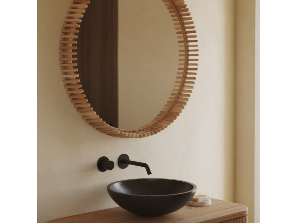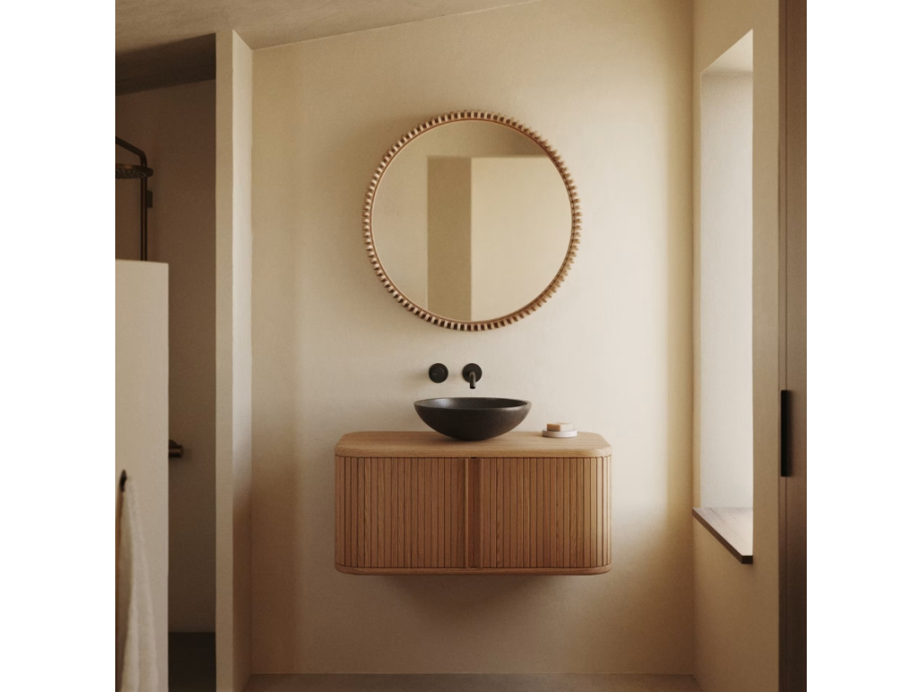 Kulaté zrcadlo Kave Home Polke zaujme svým originálně tvarovaným rámem tvořeným kousky teakového dřeva – skvěle se tak hodí do přírodně laděných interiérů. Zavěsit ho můžete třeba nad komodu v obývacím pokoji nebo nad postel v ložnici, vybraný prostor nejen ozdobí, ale také opticky zvětší. Díky jeho odolnosti vůči vlhkosti ho ale můžete bez obav využít také v koupelně. Dostupné je ve třech velikostech – v prostornějších interiérech je můžete na zdi nakombinovat a docílit tak ještě zajímavějšího doplňku interiéru.
