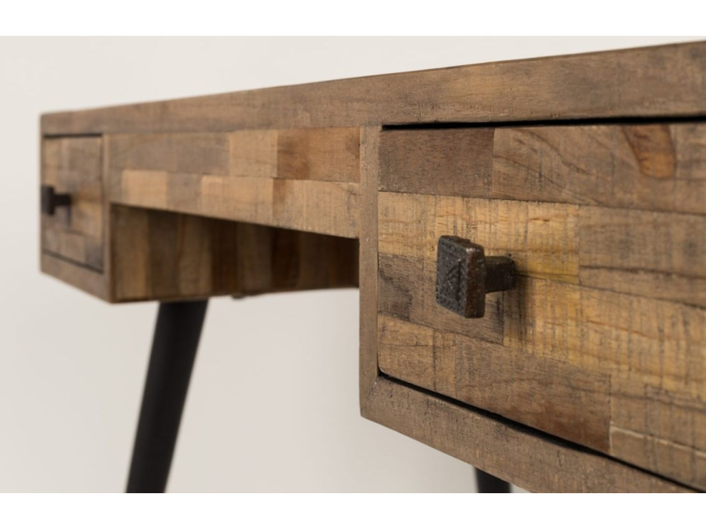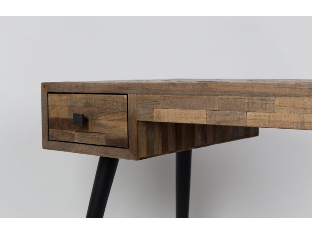 Kancelářský stůl Leo obohatí váš interiér o poctivý kus elegantního, unikátního a přírodního nábytku. Deska stolu je vyrobena z recyklovaných teakových částí dřeva, které jsou umístěny na dřevovláknitém podkladu. Elegantní je především spojení dřevěné desky a mírně zkosené ocelové podnože. Černá ocelová podnož je důmyslně sladěná s černými držáky od zásuvek.