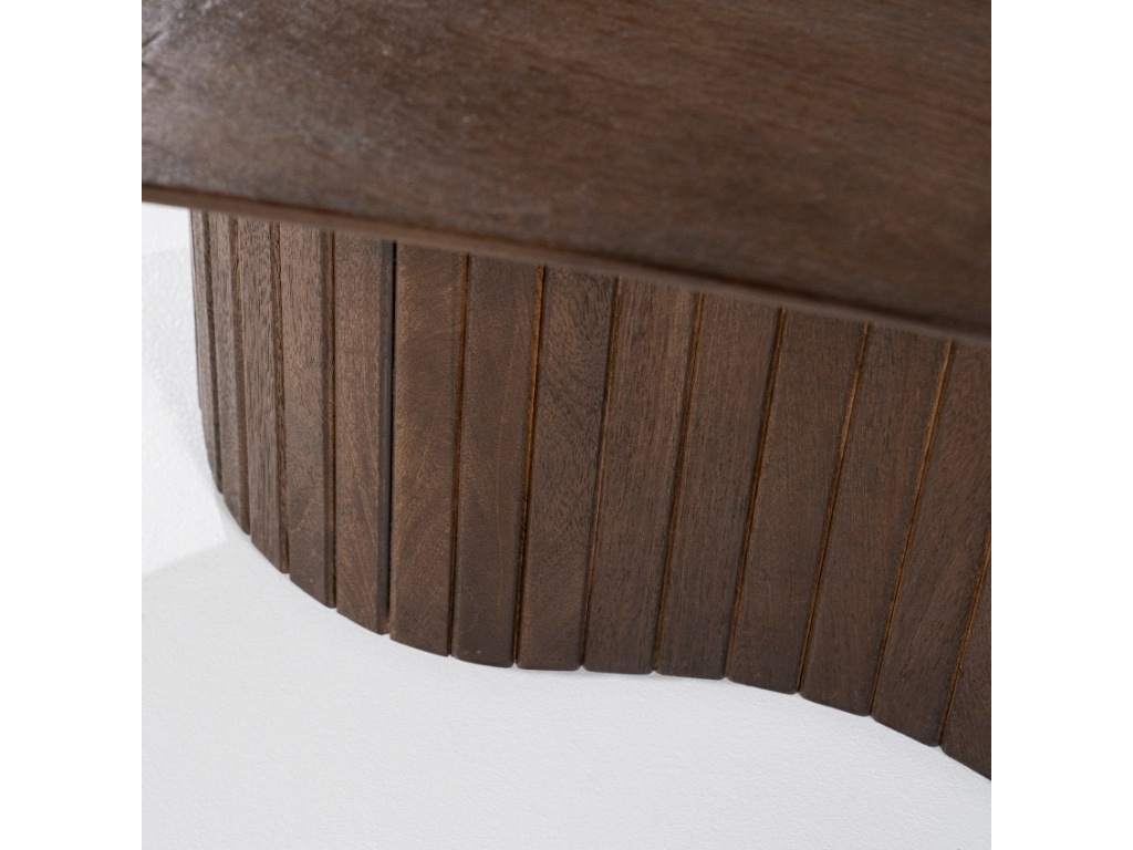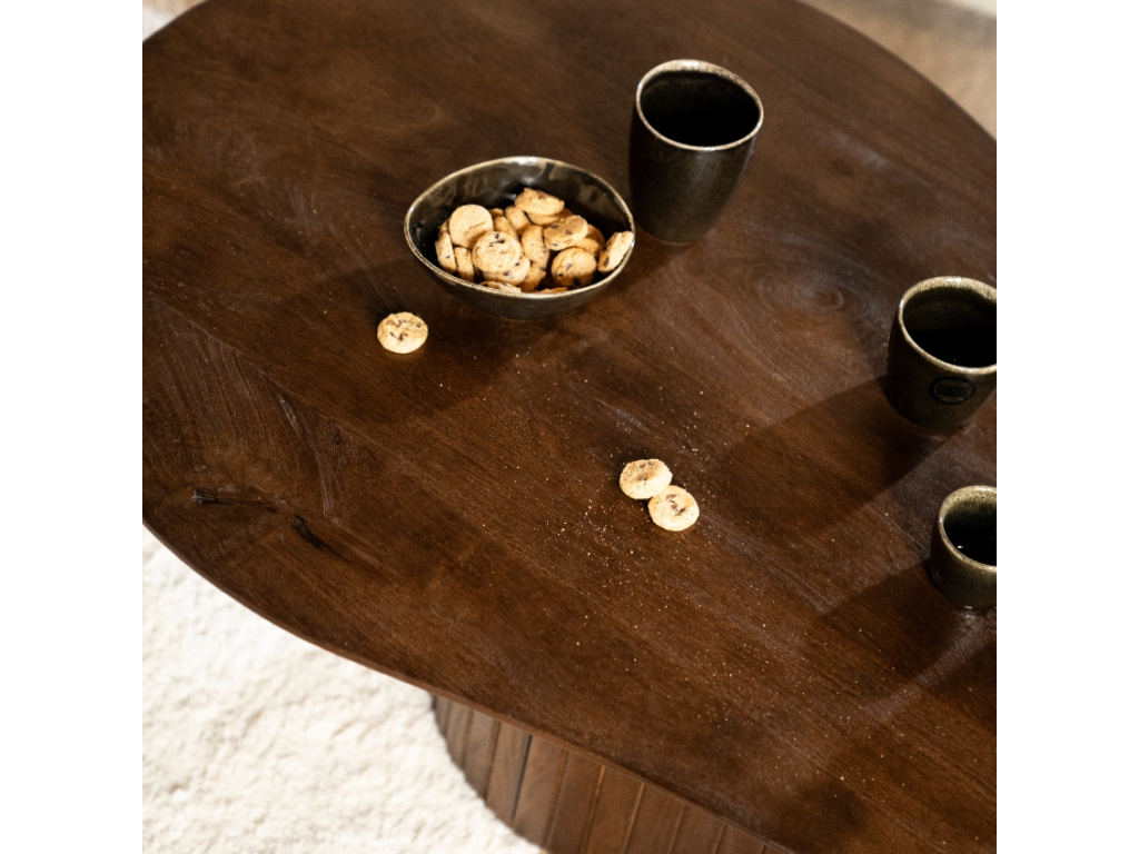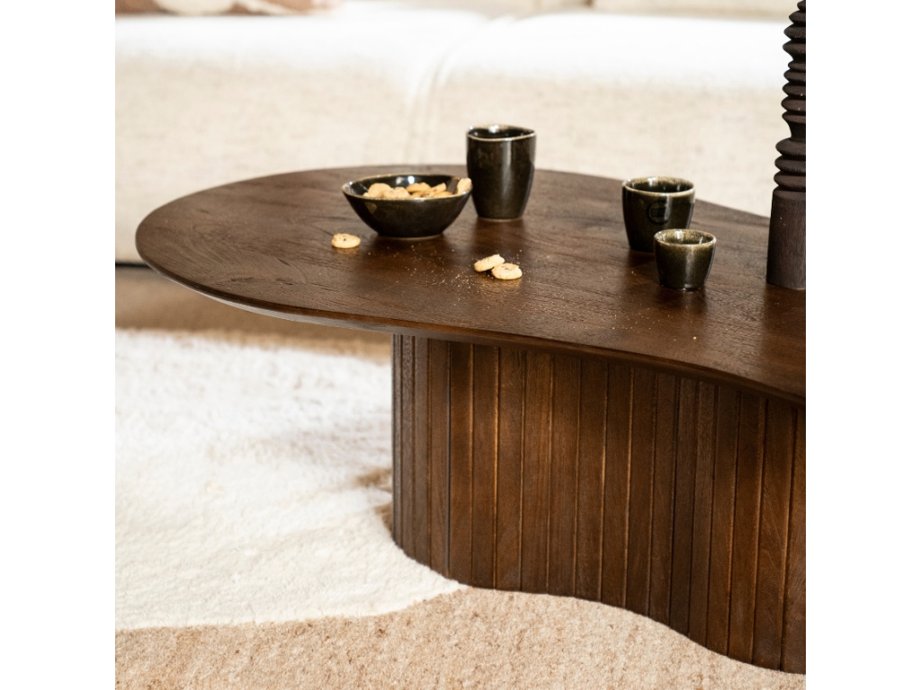 Nechte se unést organickými tvary designového konferenčního stolku Jordy od značky Eleonora, který vás okouzlí svými křivkami, ale i kvalitním materiálem. Kolekce Jordy nabízí různě velké jídelní stoly či právě tento elegantní konferenční stolek. Stolek je vyroben z masivního mangového dřeva v hnědém odstínu, díky čemuž perfektně zapadne do klasických i rustikálně laděných interiérů. Dřevěná podnož se skládá z jednotlivých pruhů dřeva, což stolku dodává jeho unikátní vzhled. Odložte si na stolek šálek kávy nebo ho ozdobte originální dekorací a doplňte vaši pohovku o tuto jedinečnou designovku!