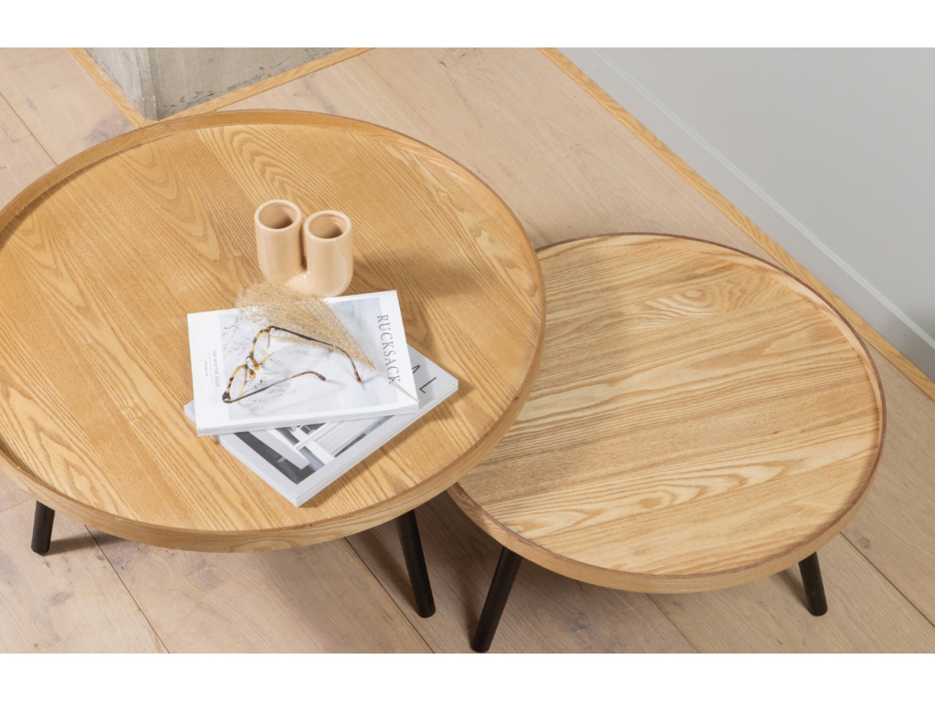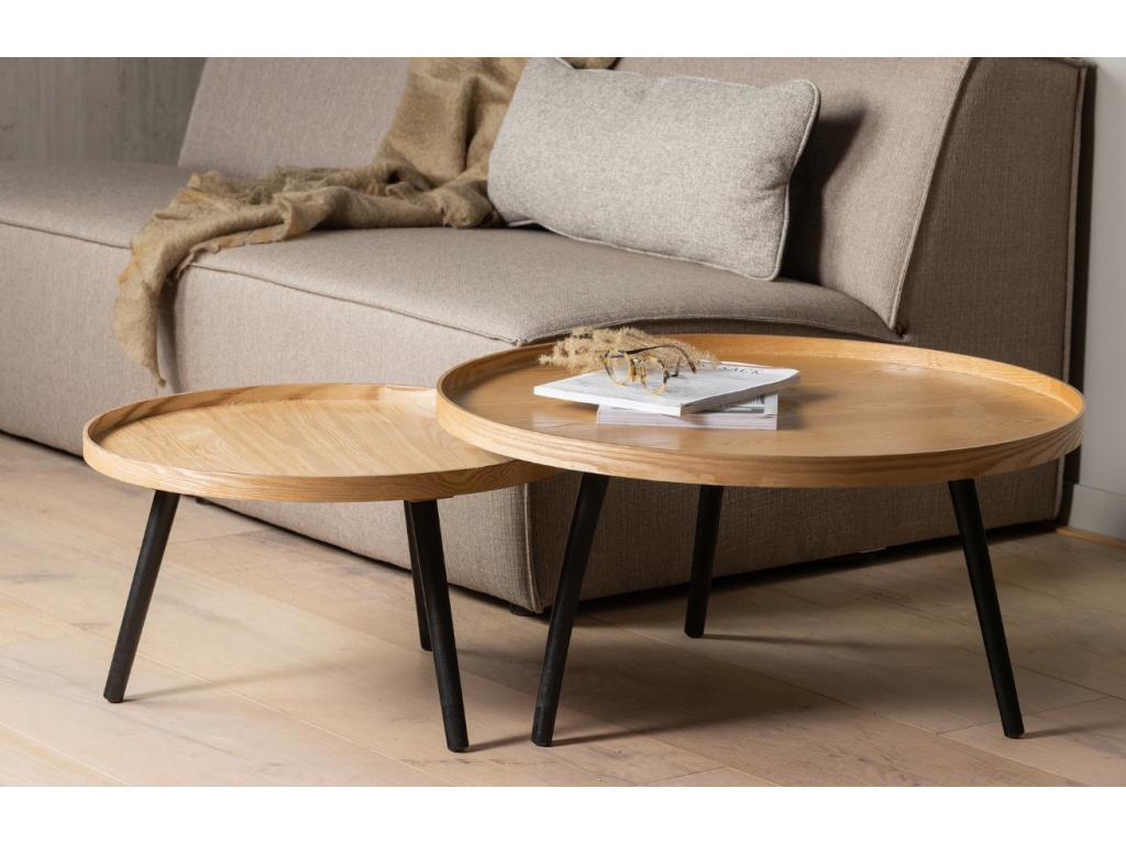 Designový konferenční stolek Mireli zaujme svým nadčasovým stylem se třemi podnožemi, které stolku propůjčují jeho retro výraz. Deska stolku je z borovicové dýhy v přírodním odstínu a má praktické, mírně vyvýšené hrany. Podnož je z černě lakovaného dřeva. V naší nabídce jsou také konferenční stolky Mireli v béžovém a černém provedení s třemi velikostmi desky – skvěle spolu ladí a snadno se kombinují!