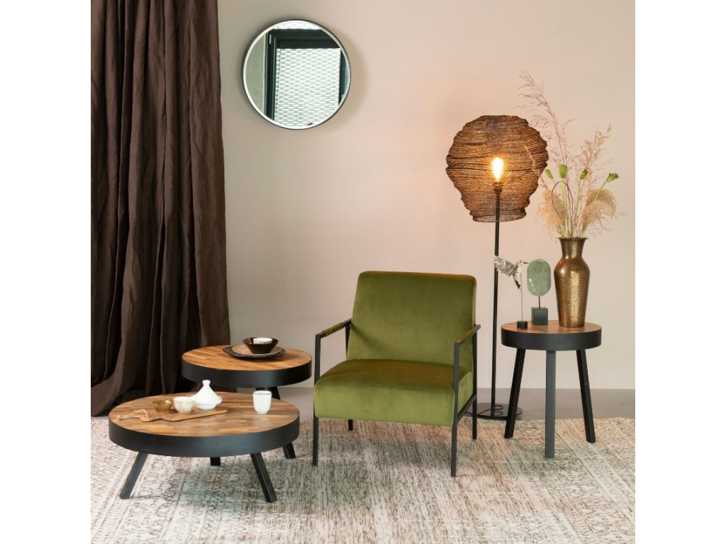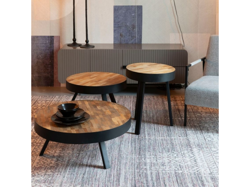 Konferenční stolek Suri s deskou z recyklovaného teakového dřeva v úchvatném spojení s rámem z měkké oceli ve starožitném černém lakování. Trojnožkovou podnož zdobí plastové kluzáky chránící vaši podlahu před poškrábáním. Za zmínku stojí i menší konferenční a odkládací stolek ze stejné produktové řady.