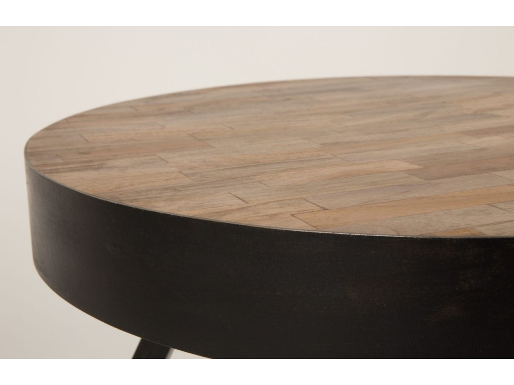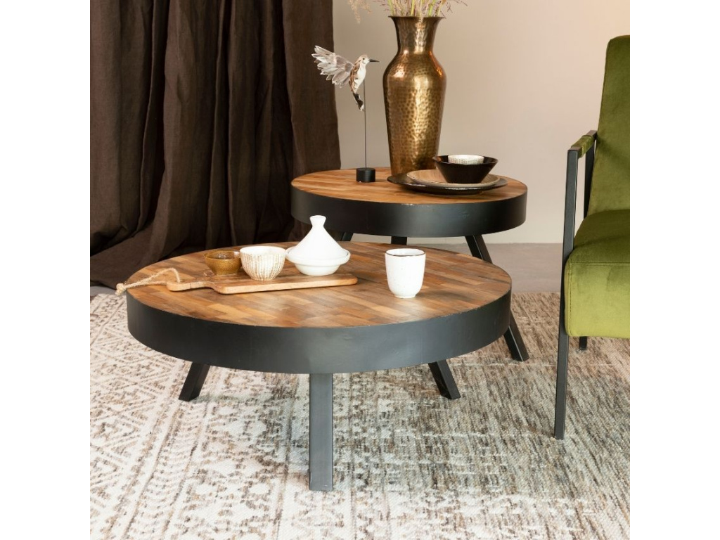 Konferenční stolek Suri s deskou z recyklovaného teakového dřeva v úchvatném spojení s rámem z měkké oceli ve starožitném černém lakování. Trojnožkovou podnož zdobí plastové kluzáky chránící vaši podlahu před poškrábáním. Za zmínku stojí i menší konferenční a odkládací stolek ze stejné produktové řady.