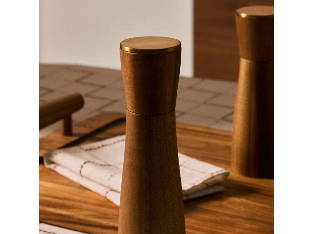 Série kuchyňských pomůcek Teppa od značky Kave Home je vyrobena z masivního akátového dřeva, které se pyšní FSC certifikací – máte tedy jistotu, že pochází z odpovědného lesního hospodářství. Kromě mlýnků na koření v sérii najdete také etažér, váleček a podnos, nebo také prkénko na krájení sýrů či vařečky. Tyto stylové pomůcky zútulní vaši kuchyň i jídelnu a díky svému nadčasovému designu s vámi vydrží dlouhé roky. Mlýnky jsou navíc ozvláštněny mosazným detailem a díky spojům z nerezové oceli se zvyšuje jejich životnost.