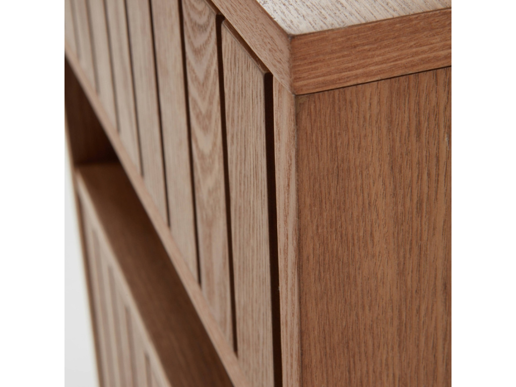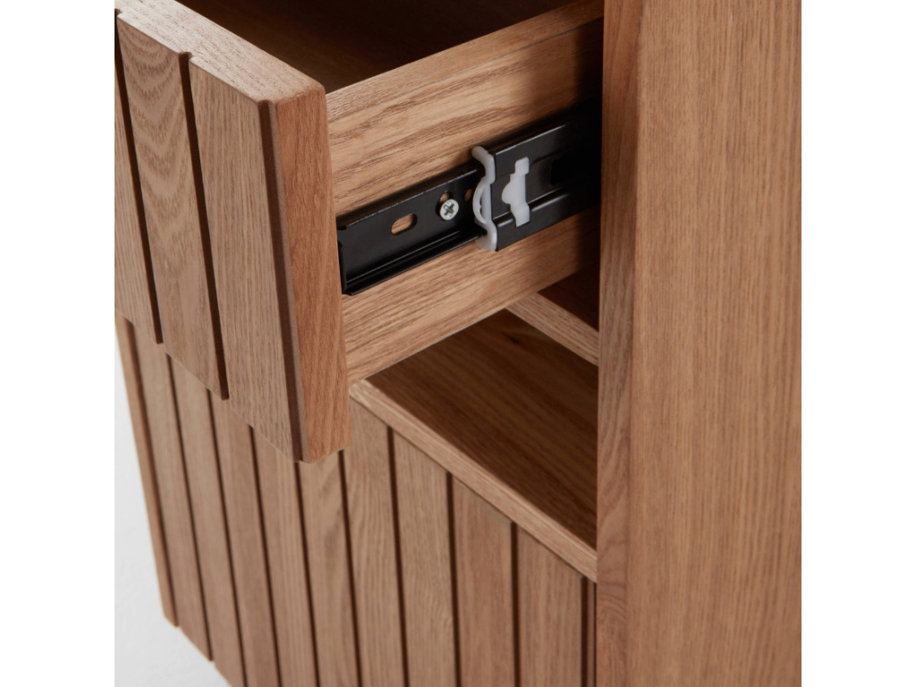 Elegantní, funkční a promyšlený do posledního detailu. Noční stolek EIRA v sobě spojuje moderní minimalismus s jemným retro nádechem, který si okamžitě získá vaši pozornost. Je vyroben z kvalitního MDF s jasanovou dýhou, které společně přinesou do ložnice přírodní texturu a nadčasovou eleganci. Čisté linie bez úchytek doplňuje praktické push-to-open otevírání, které dává vyniknout minimalistické siluetě. Praktičnost doplňuje volitelné zavěšení dvířek na pravou nebo levou stranu, což umožňuje umístění stolku po obou stranách postele. EIRA je noční stolek, který si ve vaší ložnici zaslouží čestné místo.