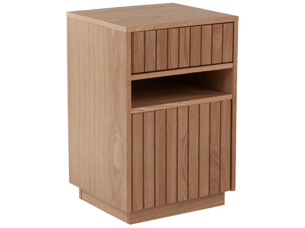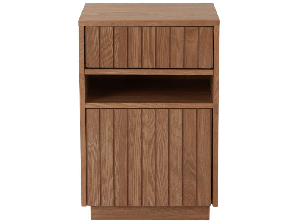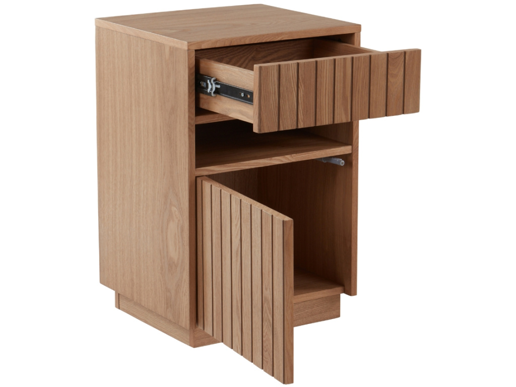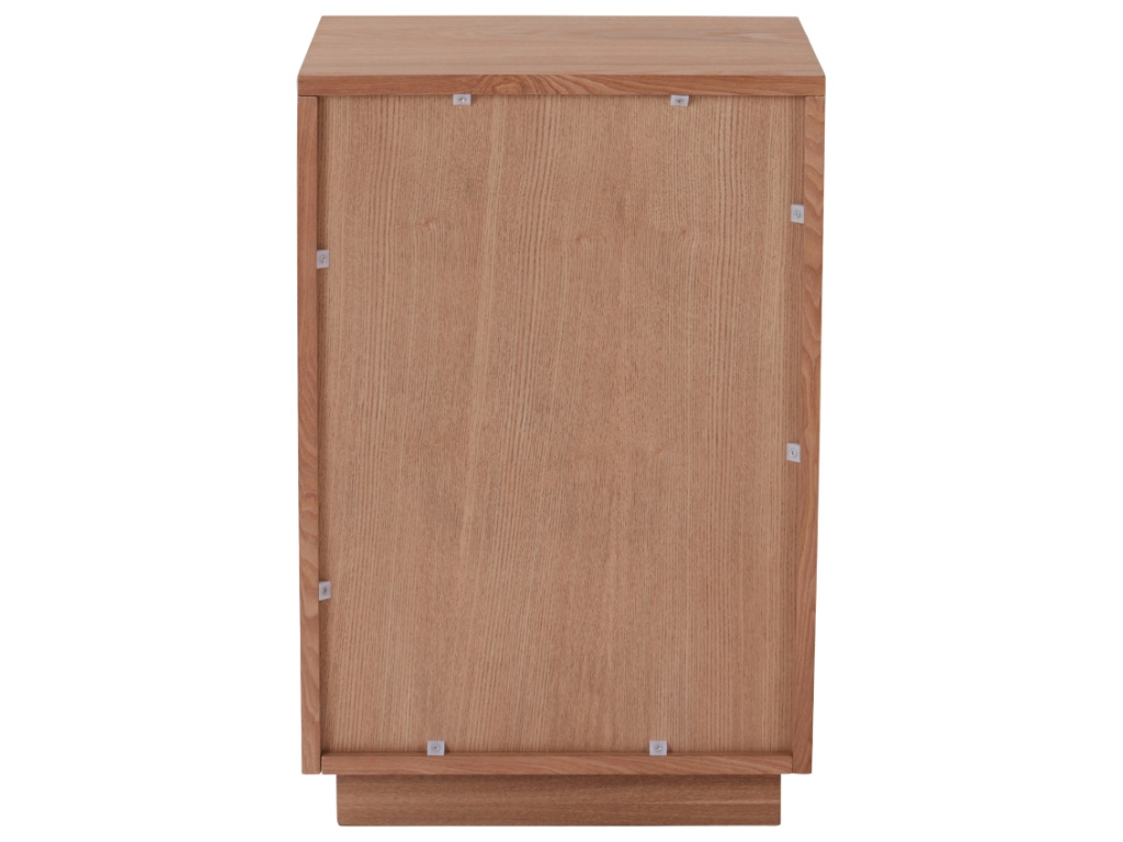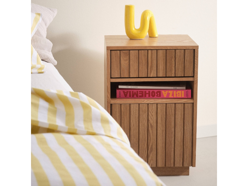 Elegantní, funkční a promyšlený do posledního detailu. Noční stolek EIRA v sobě spojuje moderní minimalismus s jemným retro nádechem, který si okamžitě získá vaši pozornost. Je vyroben z kvalitního MDF s jasanovou dýhou, které společně přinesou do ložnice přírodní texturu a nadčasovou eleganci. Čisté linie bez úchytek doplňuje praktické push-to-open otevírání, které dává vyniknout minimalistické siluetě. Praktičnost doplňuje volitelné zavěšení dvířek na pravou nebo levou stranu, což umožňuje umístění stolku po obou stranách postele. EIRA je noční stolek, který si ve vaší ložnici zaslouží čestné místo.