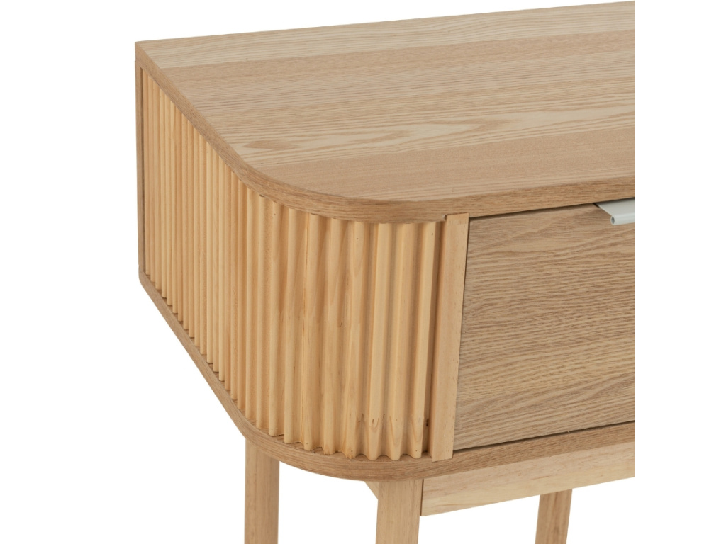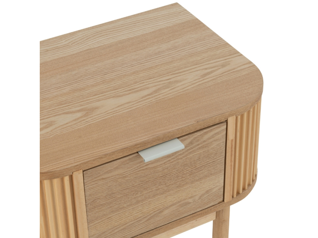 Objevte kouzlo jednoduchosti s nočním stolkem Rounded. Jeho přírodní odstín a hladká textura dřeva vytvářejí klidnou atmosféru ideální pro odpočinek. Elegantní drážkované bočnice dodávají jemný designový detail, zatímco praktická zásuvka uchová všechny nezbytnosti na dosah ruky. Stabilní štíhlé nohy působí lehce a vzdušně, takže stolek nepřehlcuje prostor. Hodí se k moderním i skandinávským ložnicím a promění váš noční koutek v harmonický prostor.