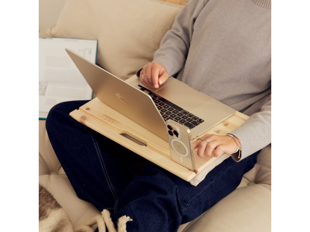 Dřevěný odkládací stolek BFF od značky Karup Design bude ideálním společníkem pro práci z postele, skvěle však poslouží i jako poměrně stabilní plocha pro odložení nejrůznějších nezbytností. Jeho odolná deska z masivní borovice zajistí, že počítač a tablet budou bezpečně držet na svém místě, o pohodlí se postará měkký polštářek s výplní z EPS kuliček umístěný na spodní straně. Jeho design vytvořila renomovaná dánská architektonická kancelář C.F. Møller Architects.