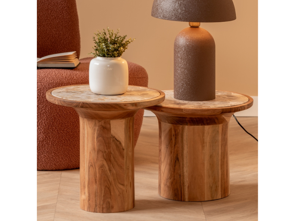 Odkládací stolek Tubio spojuje funkčnost s elegancí a přináší do vašeho interiéru praktický prvek s působivým designem. Čisté linie spolu s hnědou mramorovou deskou a konstrukcí z mangového dřeva vytvářejí harmonický kontrast, který vynikne v každém interiéru. Tento jedinečný stolek je ideální volbou pro ty, kteří chtějí stylově doladit svůj prostor a zároveň získat praktické místo pro odkládání. Tubio je dostupný ve dvou velikostech, takže si snadno vyberete ten, který perfektně zapadne do vašeho domova. Učiňte svůj domov ještě krásnějším s odkládacím stolkem Tubio.