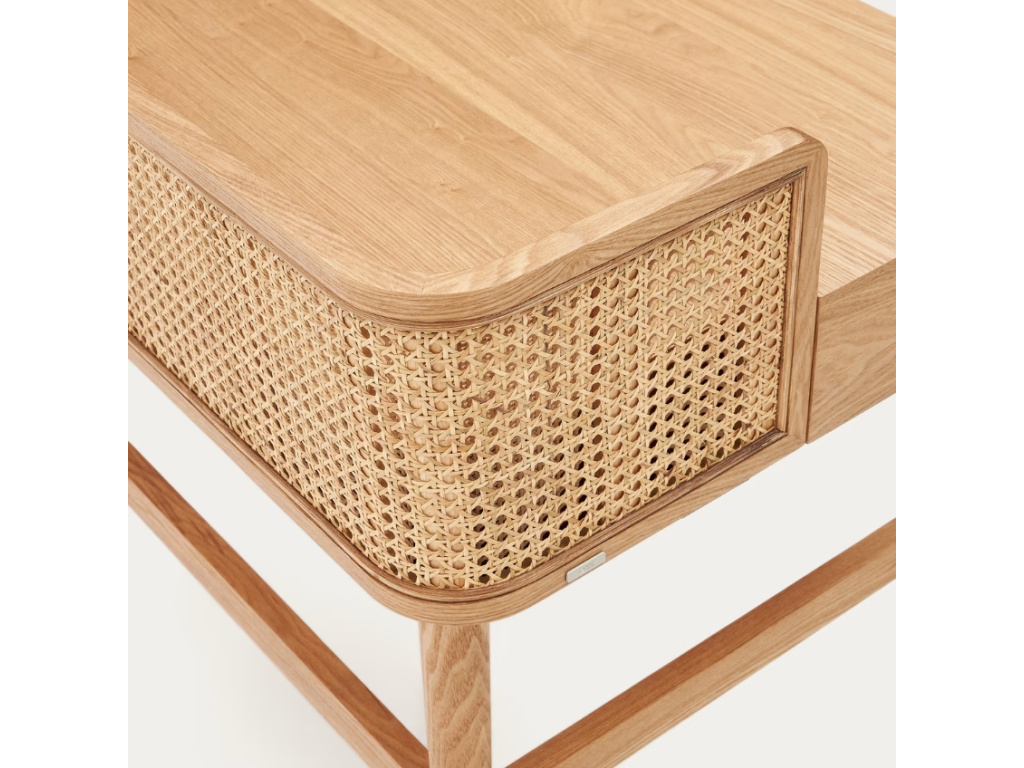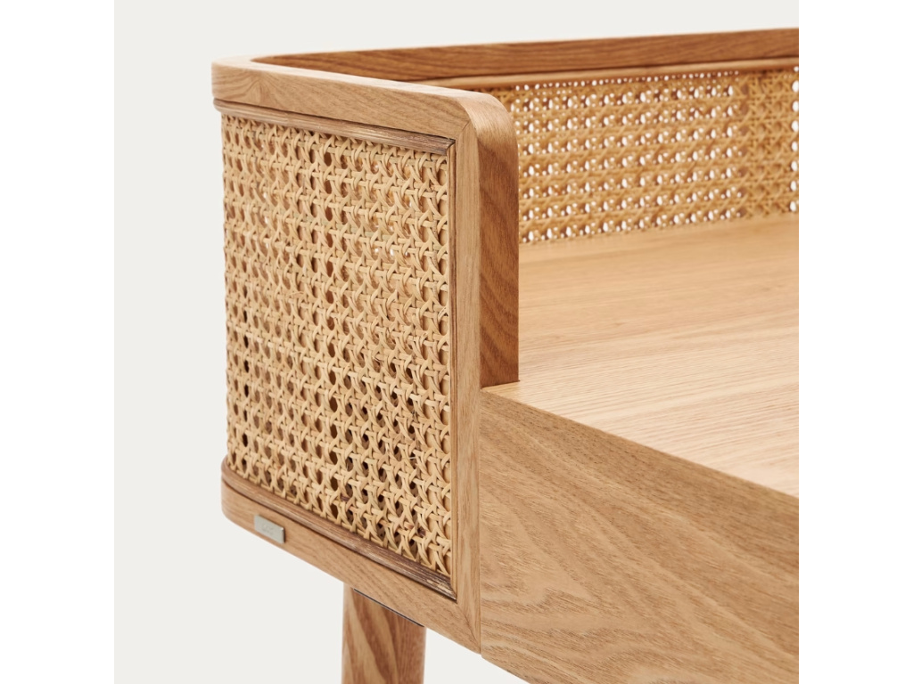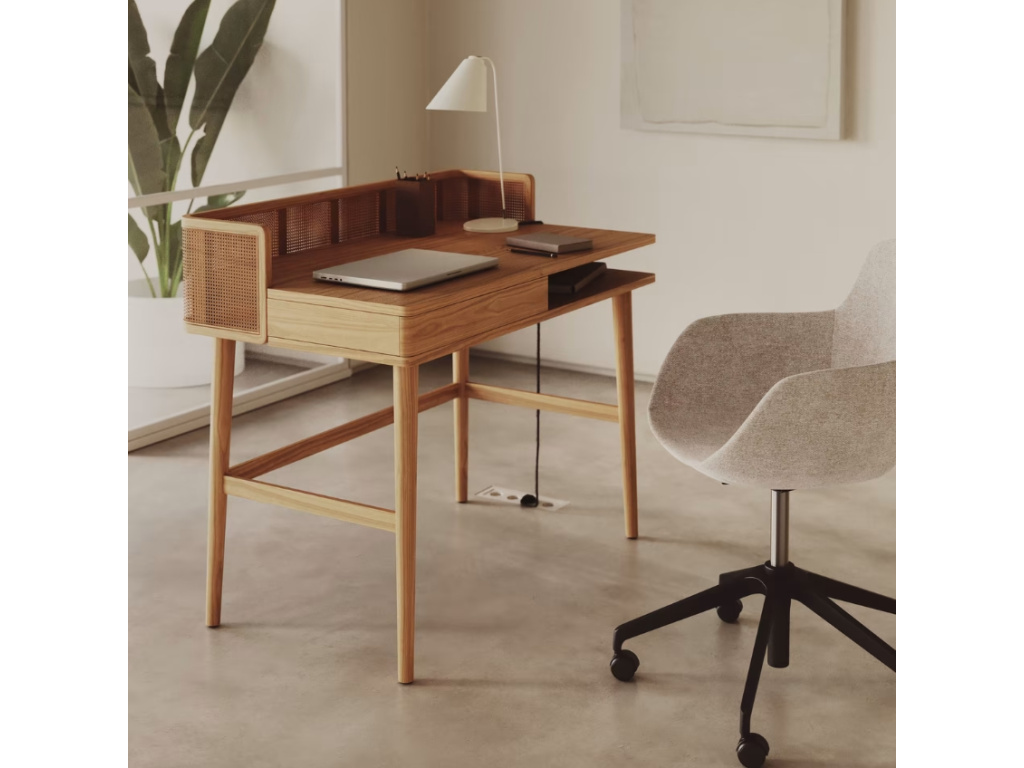 Se stylovým pracovním stolem Kave Home Araxi bude práce i studium rázem příjemnější. Je totiž radost na něj pohledět! A navíc disponuje praktickými detaily, které si zamilujete. Úložný prostor v podobě zásuvky a otevřené police vám pomůže uspořádat dokumenty, psací potřeby a různé drobnosti a cennosti a díky vyvýšené zadní stěně získáte pocit soukromí a nic vám ze stolu jen tak neupadne. Kombinace masivní podnože z jasanového dřeva, jasanové dýhy a ratanu navíc interiér zútulní a dodá mu hřejivou atmosféru.