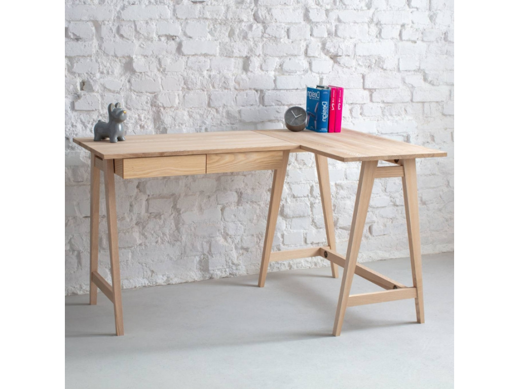 Hledáte-li do vaší pracovny rohový stůl ve skandinávském designu, je RAGABA LUKA právě pro vás. Stůl ve tvaru L je sestaven ze dvou obdélníkových stolů usazených na podnoži, vyrobené z masivního jasanového dřeva, stejně tak jako deska. Dvě praktické zásuvky vám zajistí dostatečné úložiště na všechny vaše potřebné věci. Díky rohovému tvaru vám stůl nabídne pohodlí a dostatečný prostor při práci. Uspořádání věcí a kancelářských potřeb tak bude o mnoho snazší. LUKA bude perfektním designovým kouskem do vaší pracovny, využití najde také v dětském nebo studentském pokoji.
