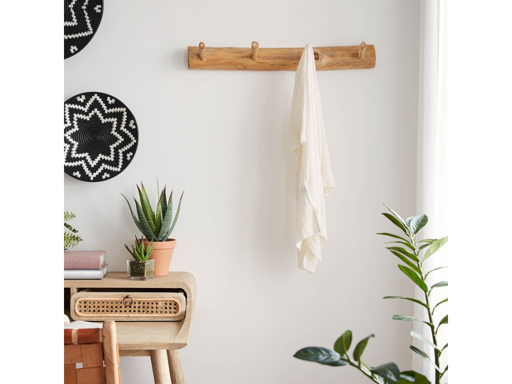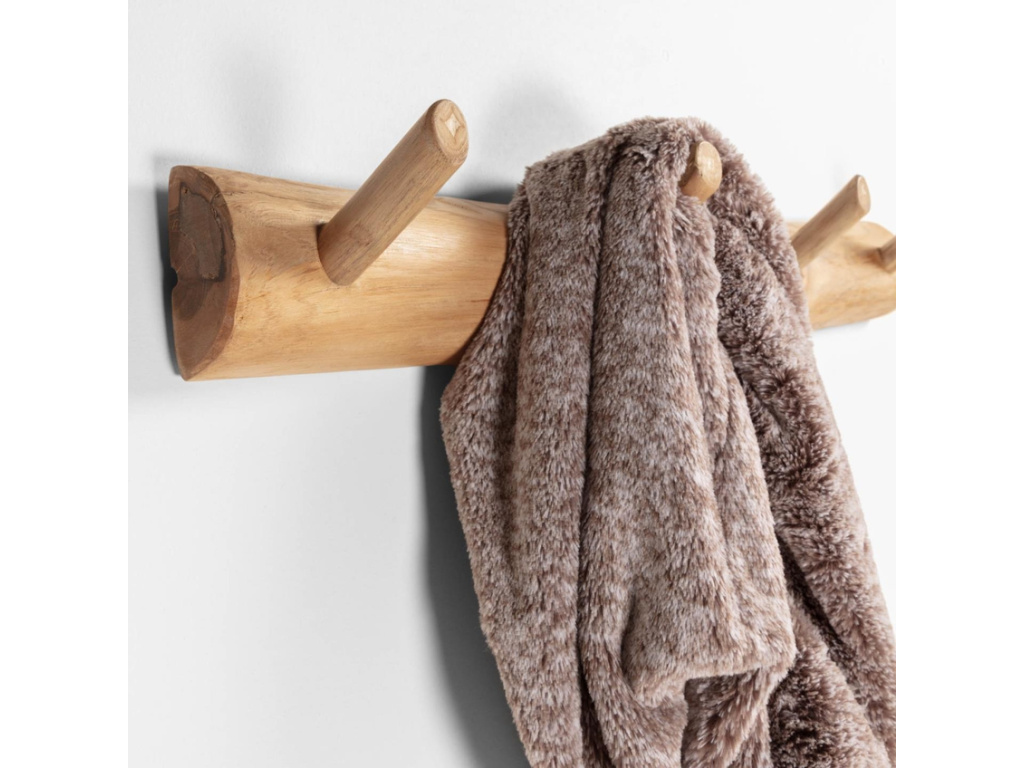 Elegantní nástěnný věšák Kave Home Gaillech zaujme svým netradičním vzhledem. Z opracovaného špalku dřeva vystupují čtyři háčky, na které můžete zavěsit Vaše oděvy. Zpracování z týkového dřeva mu zajišťuje krásný přírodní design, který ocení nejen nadšenci do skandinávského a ekologicky smýšlejícího stylu.