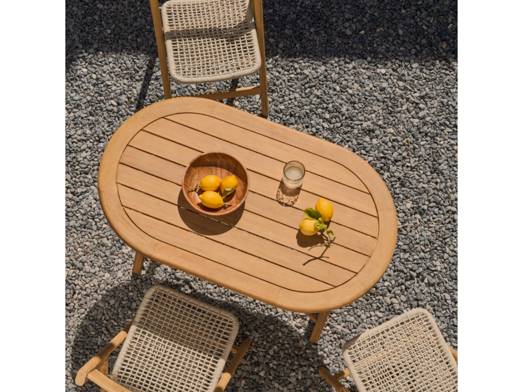 Série zahradního nábytku Kave Home Dandara dodá každému venkovnímu posezení eleganci a styl – tyto designové kousky rozhodně neuniknou pozornosti žádné vaší návštěvy. Najdete v ní lehátka, stolky i židle, takže celý prostor může být dokonale sladěn. Oválný stůl se pyšní masivní akátovou deskou a potěší možností kdykoliv ho snadno složit – zabere tak při uskladnění daleko méně místa. Představuje ideální místo třeba pro snídani na čerstvém vzduchu, ať už na balkoně, terase nebo pod pergolou. Jistě si u něj náležitě vychutnáte i sklenku vína se svou oblíbenou kamarádkou!
