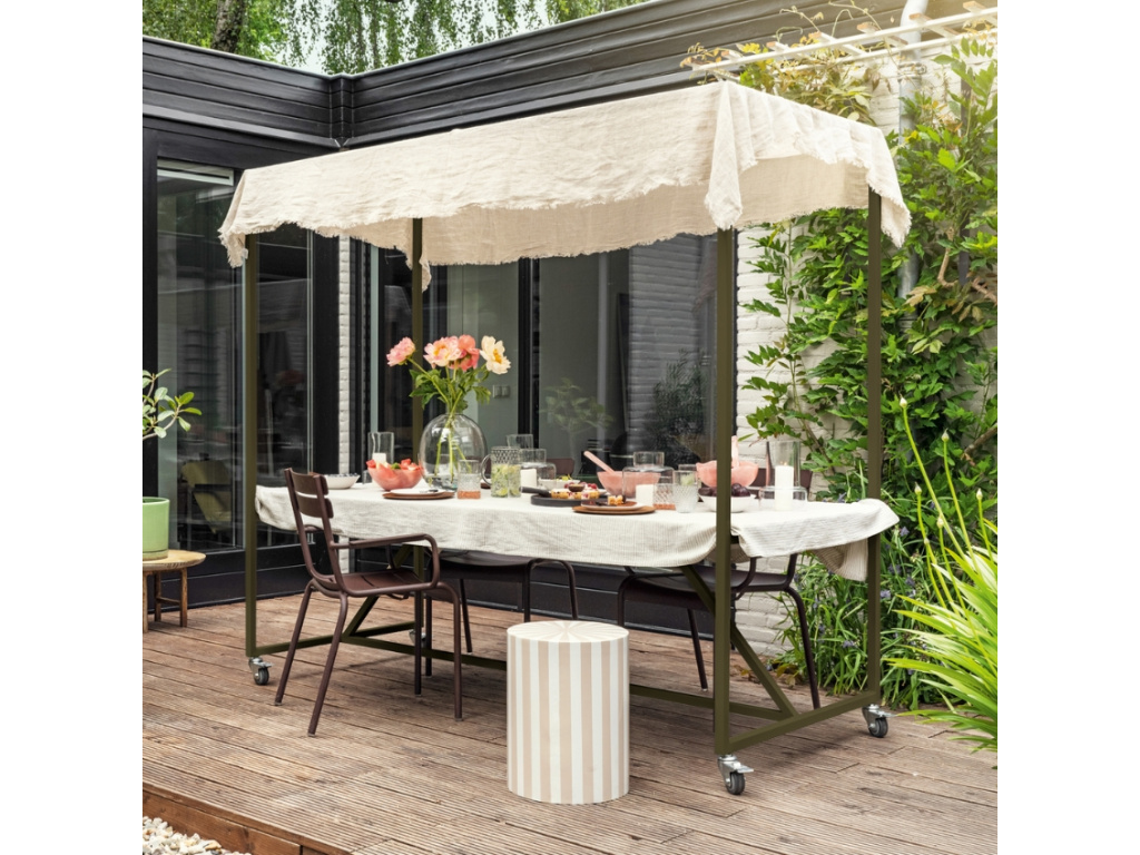 Jedinečný design zahradního stolu Heaven ozdobí jakoukoliv terasu nebo zahradu! Jeho deska je vyrobená z eukalyptového dřeva a nad sebou má ozdobný kovový rám v tmavě zeleném laku. Ten umožňuje jednoduché zavěšení světelného řetězu, rostlin nebo třeba připevnění textilie proti přímému slunci pro váš větší komfort. Stůl má navíc pojízdná kolečka s brzdami, která usnadňují jeho přemisťování. Jednoduchá konstrukce přímo vybízí vyzdobit ji podle vaší fantazie a aktuální sezóny. S jediným kouskem nábytku tak můžete mít několikrát do roka zcela nový zahradní koutek, kde se budete cítit příjemně.