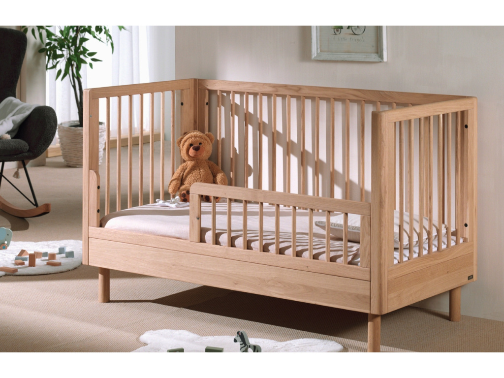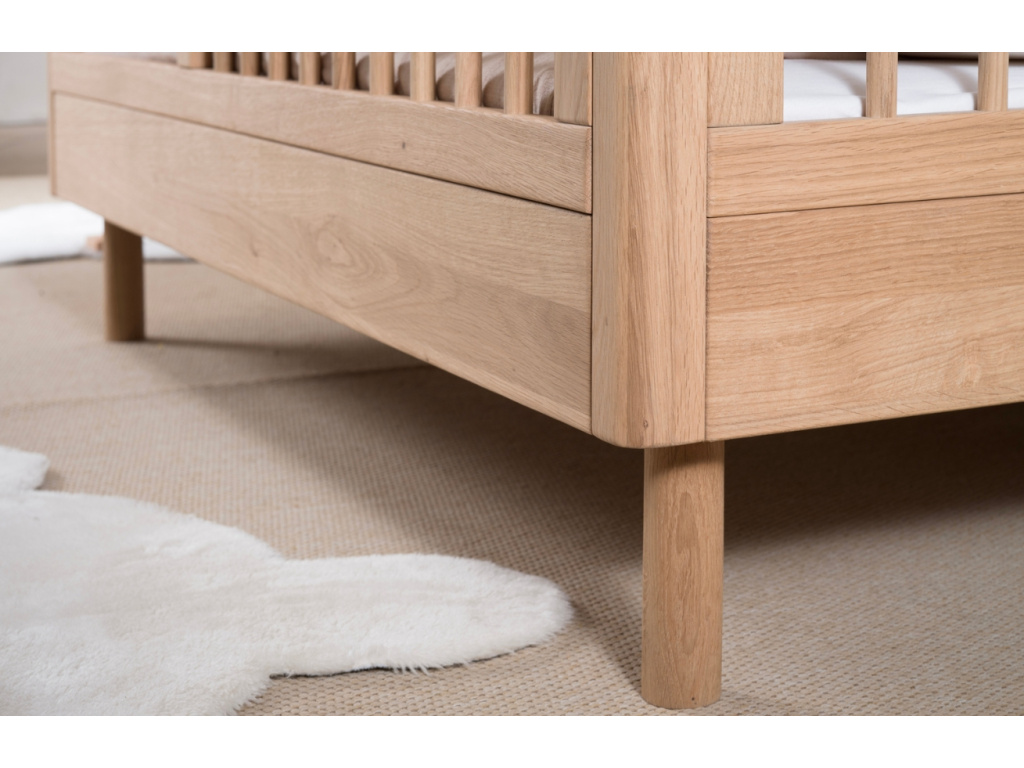 Dětská postýlka z kolekce Forrest je vyrobena z kvalitního evropského dubu a vyniká stabilní konstrukcí i precizním zpracováním. Nabízí tři nastavitelné výšky roštu a možnost vyjmutí tří tyček, což usnadňuje přístup k dítěti. Lze ji snadno přeměnit na klasickou dětskou postel, takže poroste spolu s vaší ratolestí. Díky promyšlenému, bezpečnému designu a nadčasovému provedení je ideální volbou pro moderní i tradiční dětské pokojíčky. Doporučujeme kombinovat s dalšími kousky z kolekce Forrest.