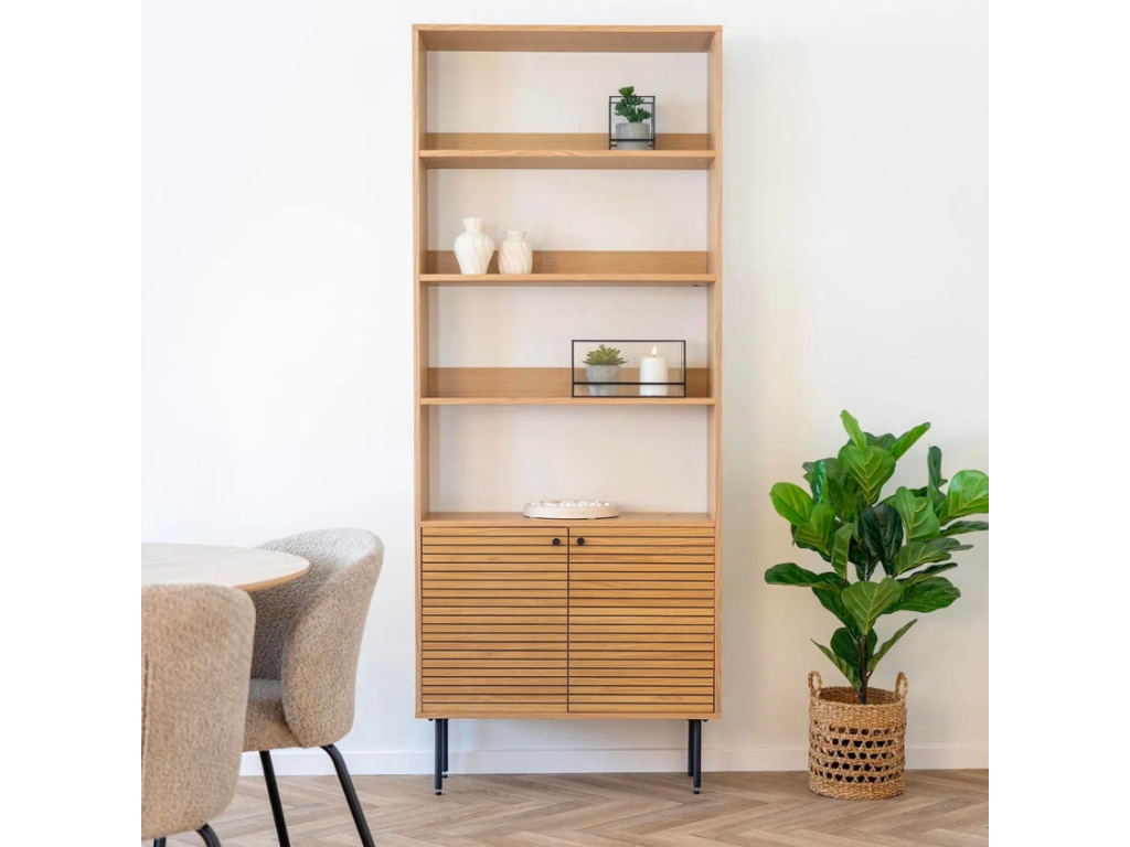 Kyoto je elegantní knihovna od značky Nordic Living, která v sobě spojuje moderní design a praktickou funkčnost. Kyoto nabízí dostatek úložného prostoru se čtyřmi policemi pro vaše knihy, dekorace nebo další doplňky. Dvě uzavíratelné skříňky s dvířky poskytují prostor pro uschování věcí, které chcete mít mimo dohled. Korpus z dubové dýhy v přírodním odstínu dodává nábytku příjemně teplý a přirozený vzhled, který se skvěle hodí do skandinávských či retro interiérů. Černě lakovaná kovová podnož pak dodává knihovně stabilitu a moderní kontrast, který podtrhuje její stylový vzhled. Nechte se okouzlit spojením krásy přírodního odstínu dřeva a jednoduchým, funkčním designem s promyšlenými detaily!