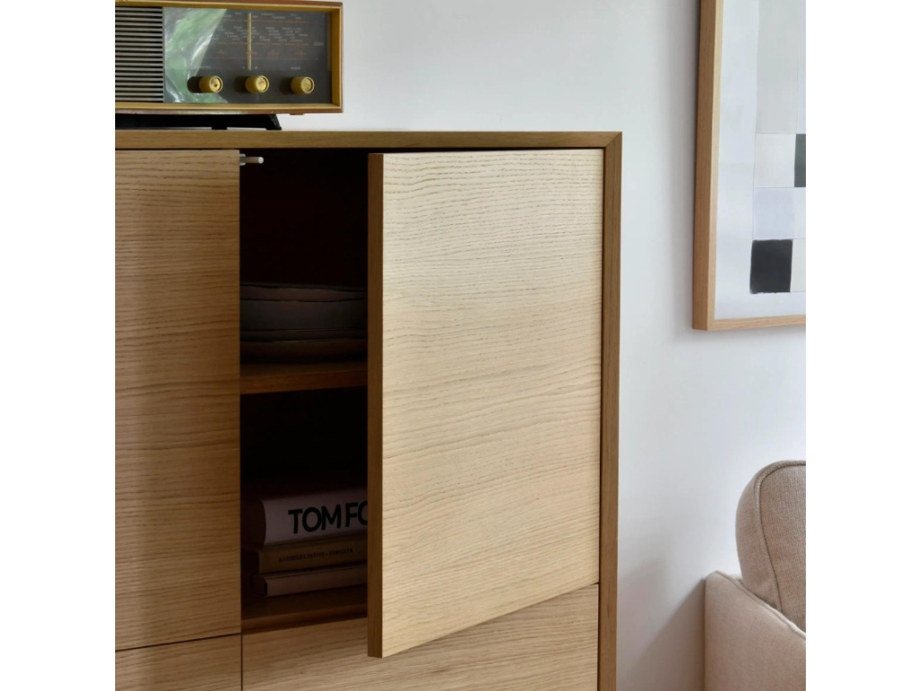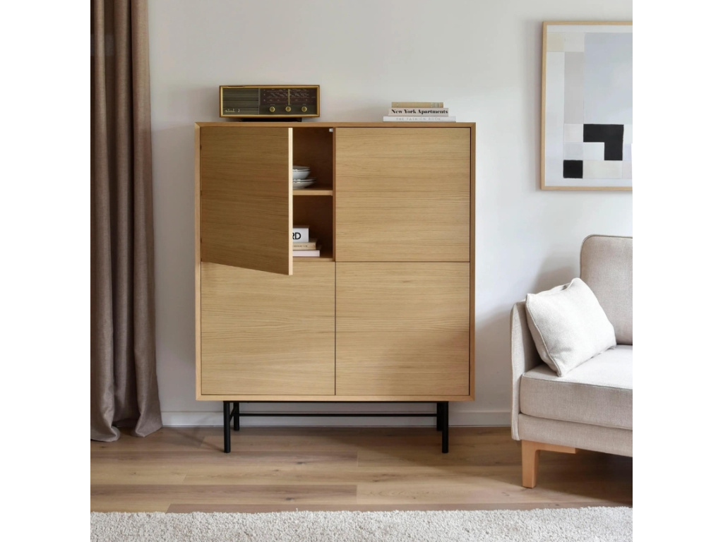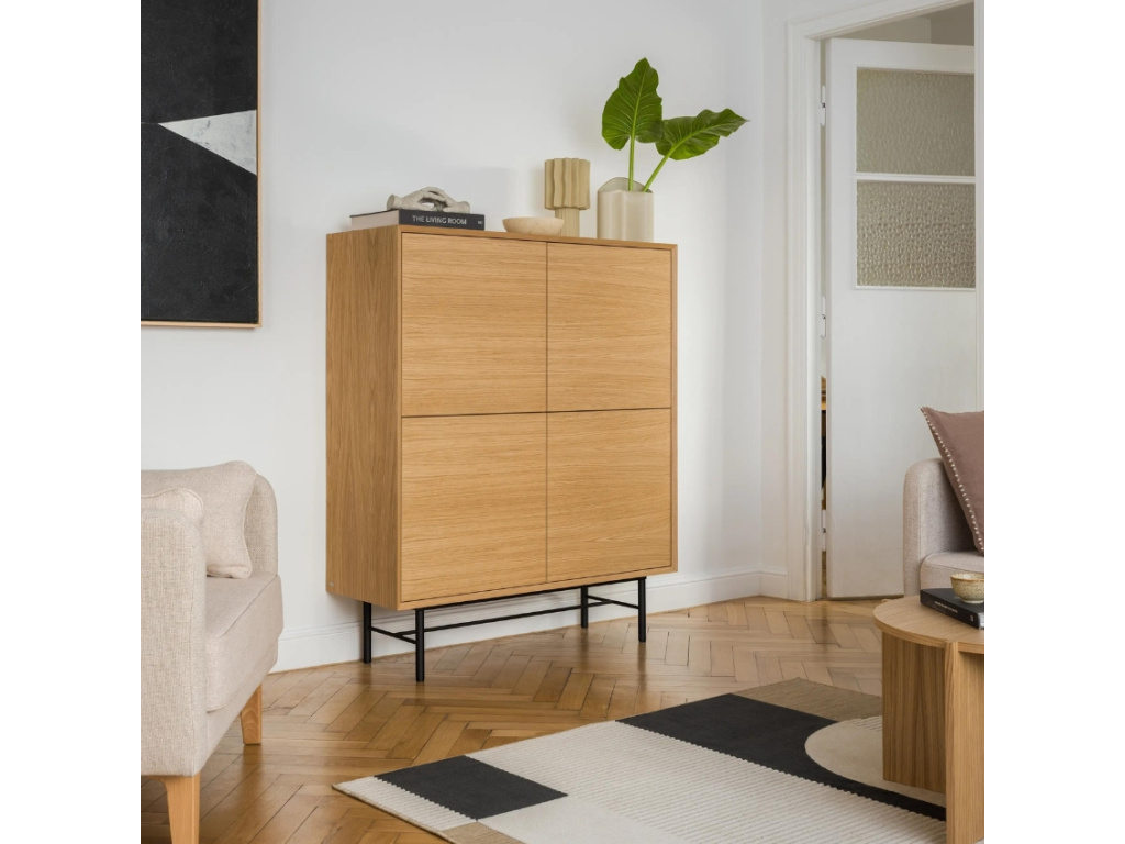 Komoda Aurora pochází ze stejnojmenné série nábytku, se kterou může být váš interiér dokonale sladěn. Minimalistický design, přírodní zbarvení a vyšší kovová podnož – to vše z ní dělá elegantní a atraktivní kousek. Úložný prostor je zastoupen celkem osmi policemi, které se skrývají za bezúchytkovými dvířky. Komoda tak zvládne uskladnit například oblečení, nádobí nebo knihy a nejrůznější dokumenty, které nechcete, aby byly všem na očích. Pořídit si ji navíc můžete také v černém provedení.