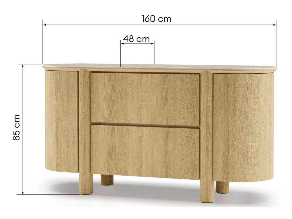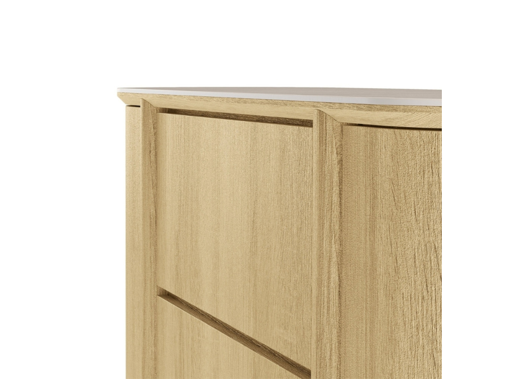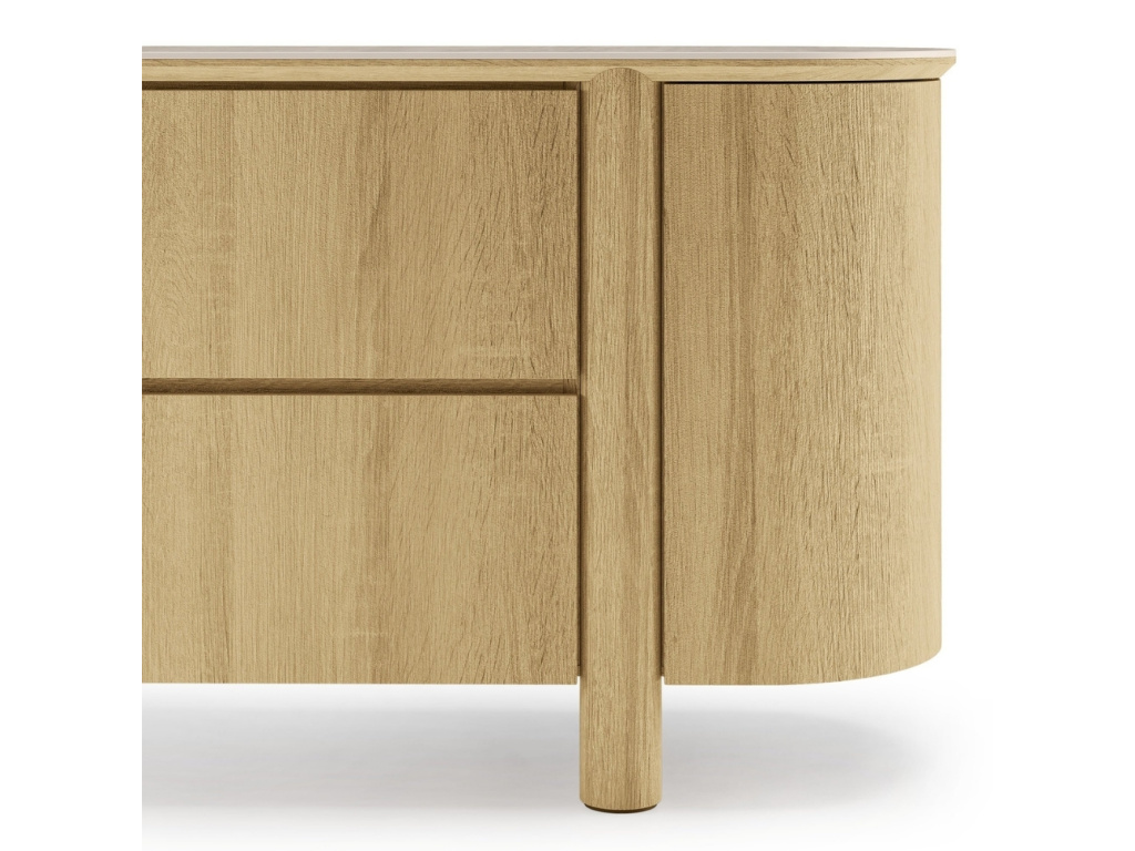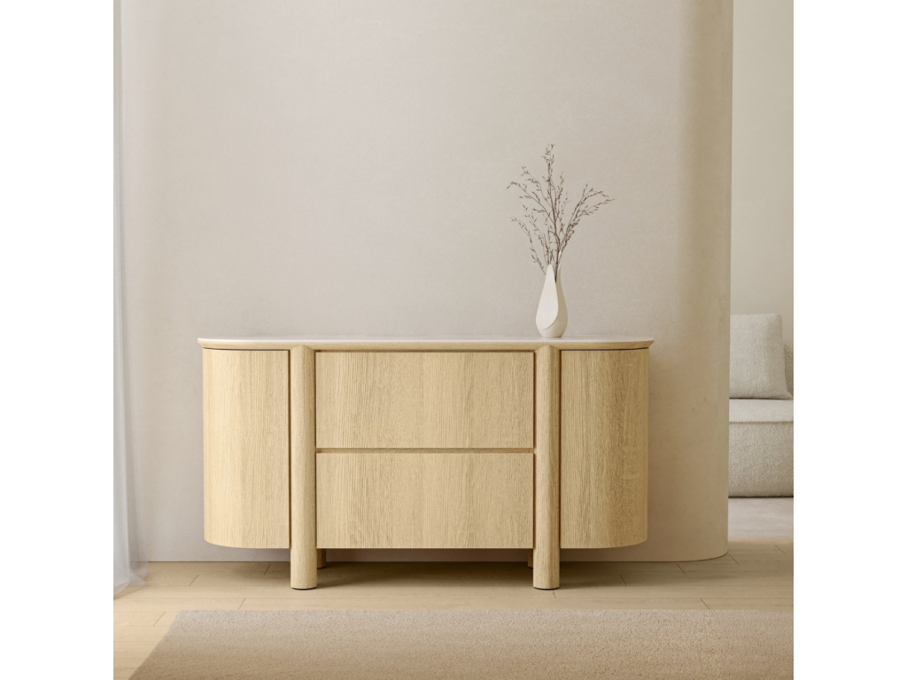 Komoda Cecile zaujme svým zaobleným tvarem a kombinací dubové dýhy a vrchní křemencové desky s travertinovým dekorem. Každý detail je promyšlený tak, aby spojoval hřejivost dřeva s elegancí kamene, čímž vzniká harmonický a nadčasový celek. Komoda nabízí úložný prostor v podobě dvojice zásuvek a čtveřice uzavřených polic – ideální pro udržení pořádku v obývacím pokoji, ložnici či předsíni. Cecile skvěle ladí se stejnojmenným konferenčním a TV stolkem, společně mohou vytvořit harmonický set, který vynikne v rustikálních i skandinávských interiérech.