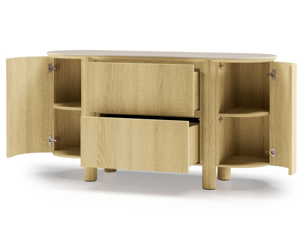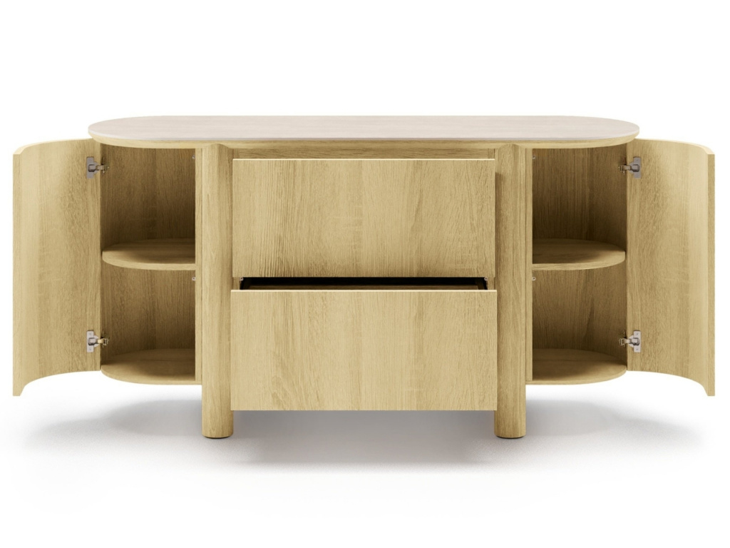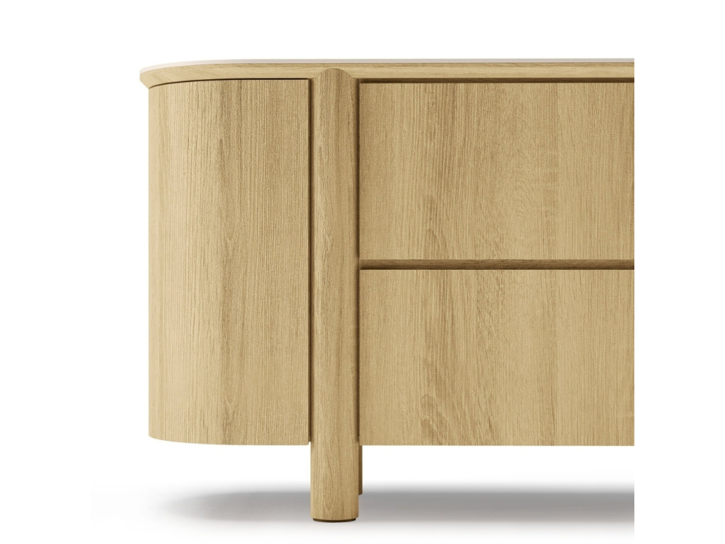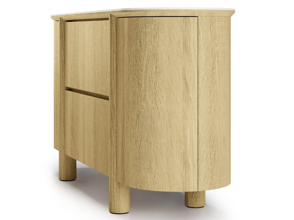 Komoda Cecile zaujme svým zaobleným tvarem a kombinací dubové dýhy a vrchní křemencové desky s travertinovým dekorem. Každý detail je promyšlený tak, aby spojoval hřejivost dřeva s elegancí kamene, čímž vzniká harmonický a nadčasový celek. Komoda nabízí úložný prostor v podobě dvojice zásuvek a čtveřice uzavřených polic – ideální pro udržení pořádku v obývacím pokoji, ložnici či předsíni. Cecile skvěle ladí se stejnojmenným konferenčním a TV stolkem, společně mohou vytvořit harmonický set, který vynikne v rustikálních i skandinávských interiérech.