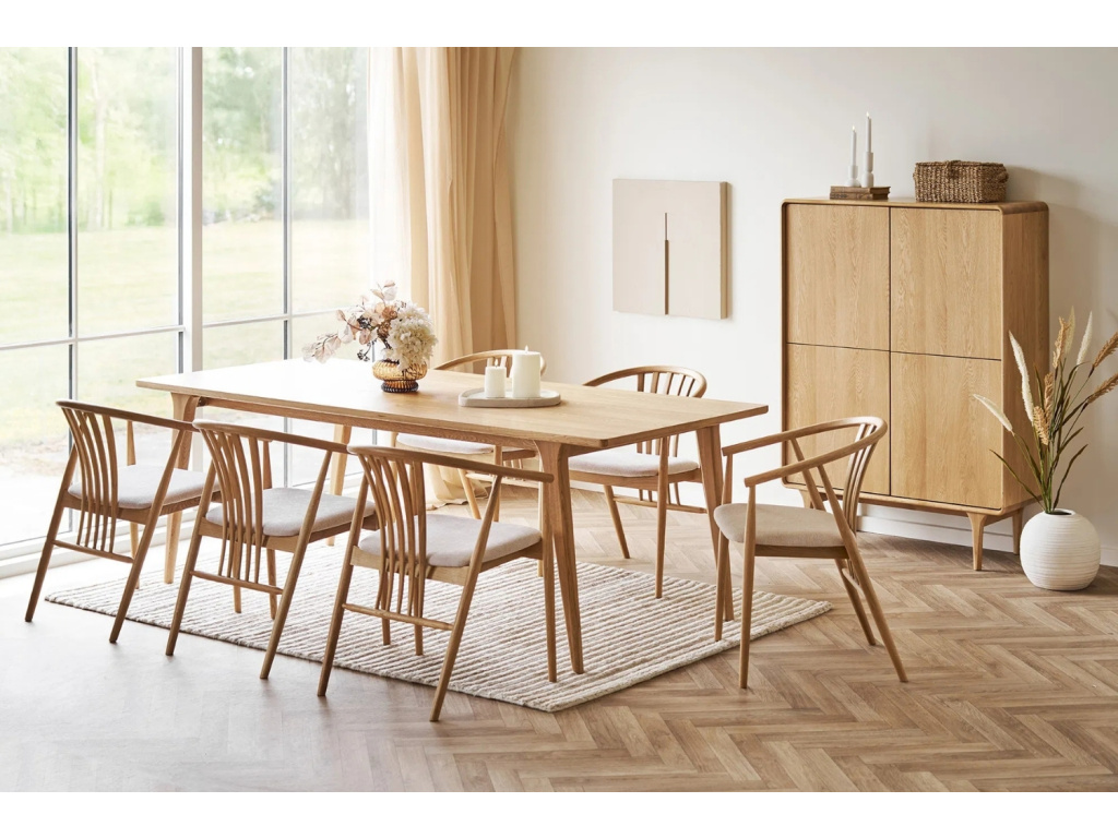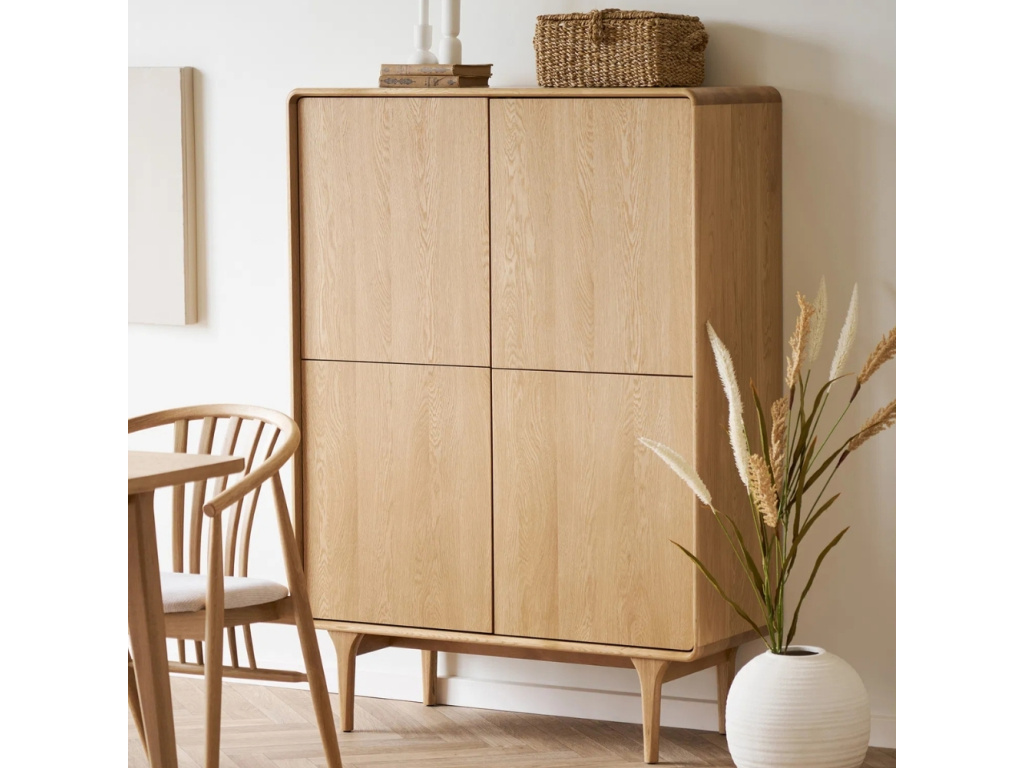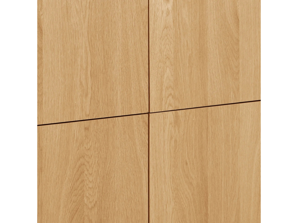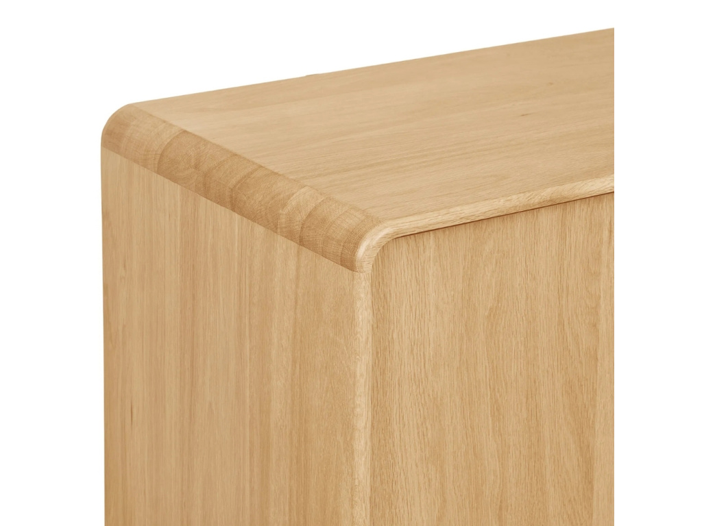 Komoda Drew vnese do vašeho interiéru přirozenou eleganci a klid, které podtrhuje světlý dubový odstín. Hladké linie a jemně zaoblené hrany působí vyváženě a vytvářejí dojem lehkosti i v menším prostoru. Vyvýšená podnož dodává nábytku vzdušnost a prakticky řešený úložný prostor za čtyřmi dvířky poskytne dostatek místa pro oblečení, nádobí nebo dokumenty. Čistý design bez úchytek zachovává minimalistický charakter komody, která se skvěle uplatní v interiéru ve stylu scandi, japandi či contemporary a podtrhne přirozenou krásu dubového dřeva. Tento kousek se stane nejen funkčním, ale také estetickým doplňkem, který zútulní váš domov.