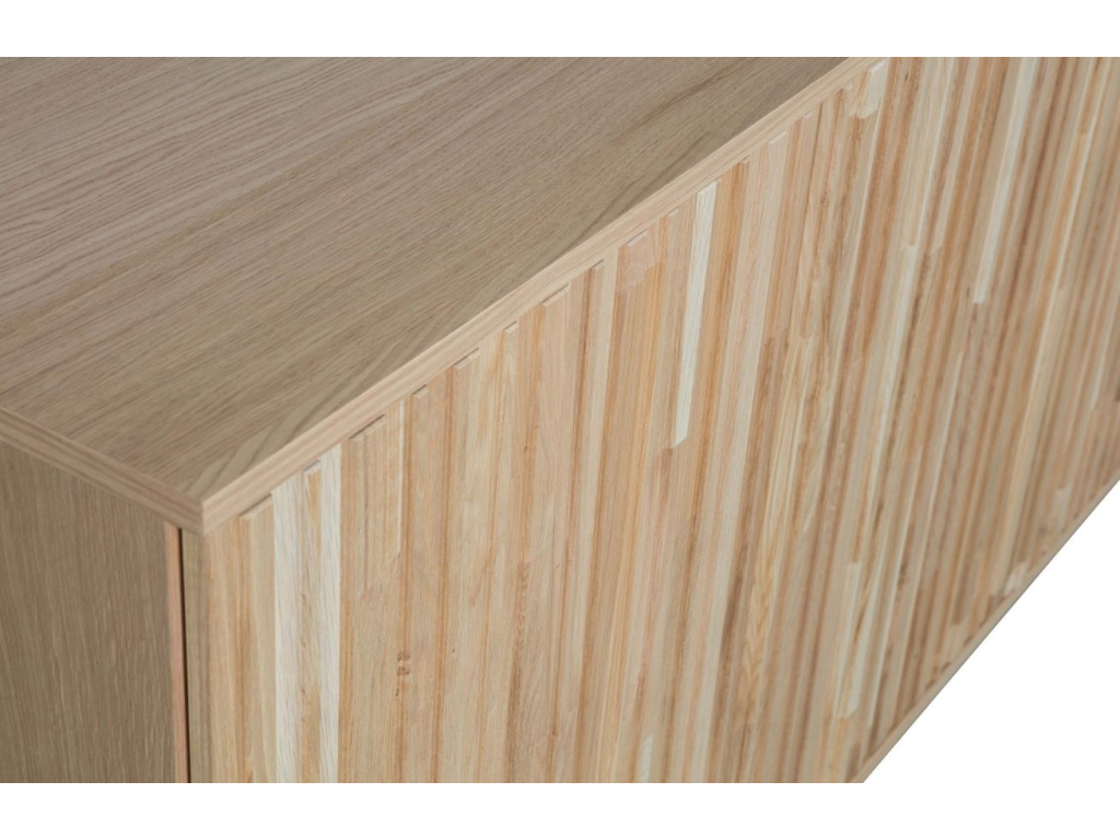 Přírodní komoda Gravia ze stejnojmenné řady nábytku nabízí jedinečný design a praktický úložný prostor v podobě osmi prostorných polic. Zajímavý motiv žebrování podtrhne celkový dojem komody a dodá ji elegantní a rustikální vzhled. Přírodní odstín dubové dýhy vnese do vašeho obývacího pokoje i jídelny pocit tepla a útulna. Jemná inspirace retro stylem dodá celému prostoru osobitý charakter.