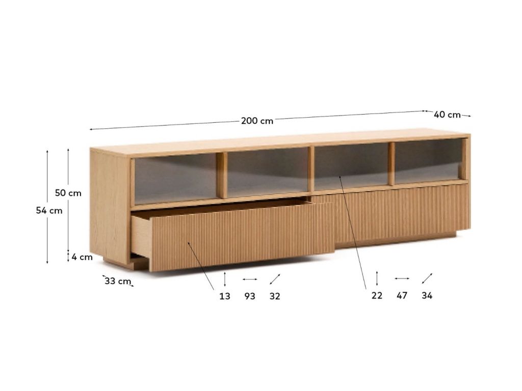 Úložné prostory ve vašem interiéru můžete vyřešit se stylovou sérií nábytku Kave Home Helvine. Kromě vitríny v ní najdete také komody několika velikostí i noční a televizní stolek. Všechny tyto kousky jsou vyrobeny z dubové dýhy pyšnící se FSC certifikací – můžete si tedy být jistí, že pochází z modelu odpovědného lesního hospodářství. Prostorná komoda přinese do interiéru úložný prostor v podobě dvou zásuvek a celkem čtyř polic, které jsou ukryty za posuvnými prosklenými dvířky. Využijte ji v obýváku nebo ložnici, ale klidně i v jídelně, kde v prosklených policích můžete vystavit svátečnější porcelán.