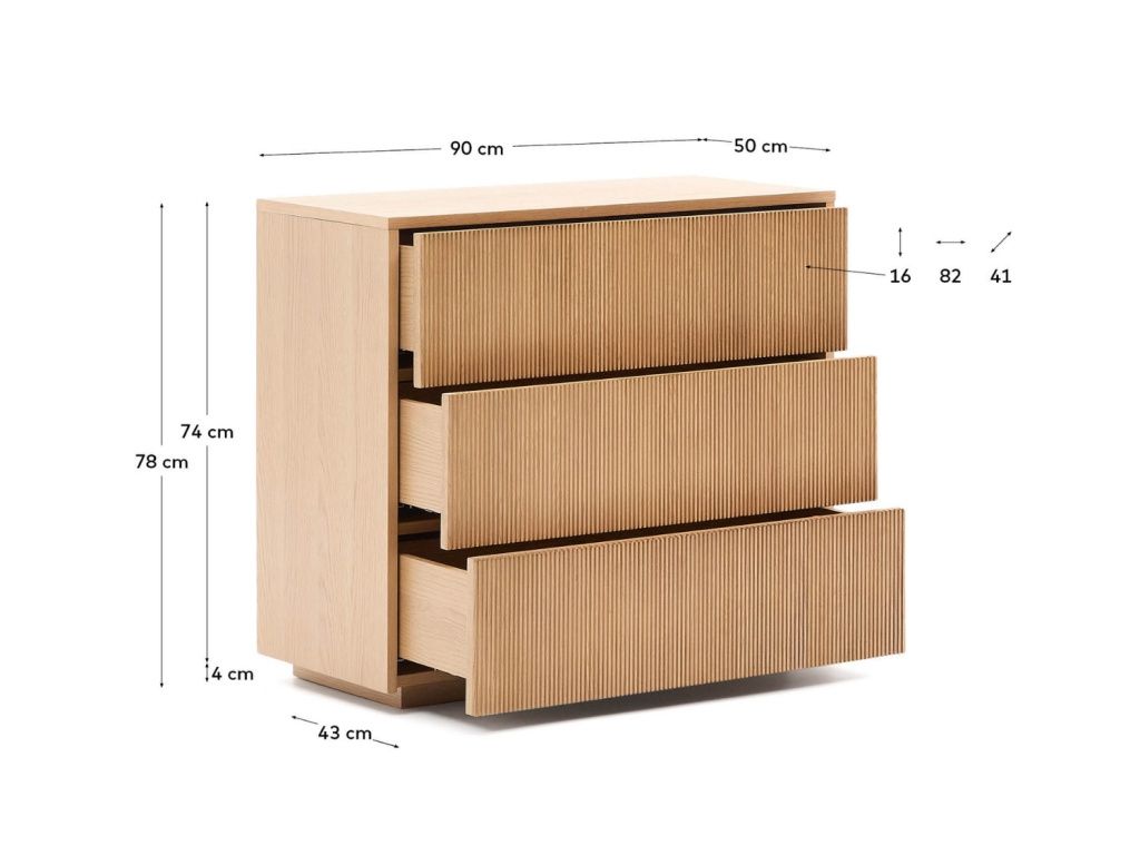 Úložné prostory ve vašem interiéru můžete vyřešit se stylovou sérií nábytku Kave Home Helvine. Kromě vitríny v ní najdete také komody několika velikostí i noční a televizní stolek. Všechny tyto kousky jsou vyrobeny z dubové dýhy pyšnící se FSC certifikací – můžete si tedy být jistí, že pochází z modelu odpovědného lesního hospodářství. Komoda Helvine přinese do interiéru úložný prostor v podobě tří prostorných zásuvek, které využijete třeba na oblečení. Umístit ji ale můžete nejen do ložnice nebo šatny – v předsíni, pracovně nebo jídelně se bude její úložný prostor také jistě hodit.