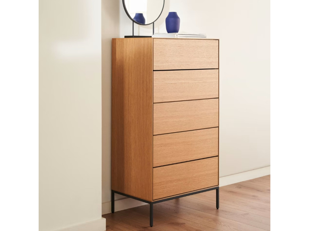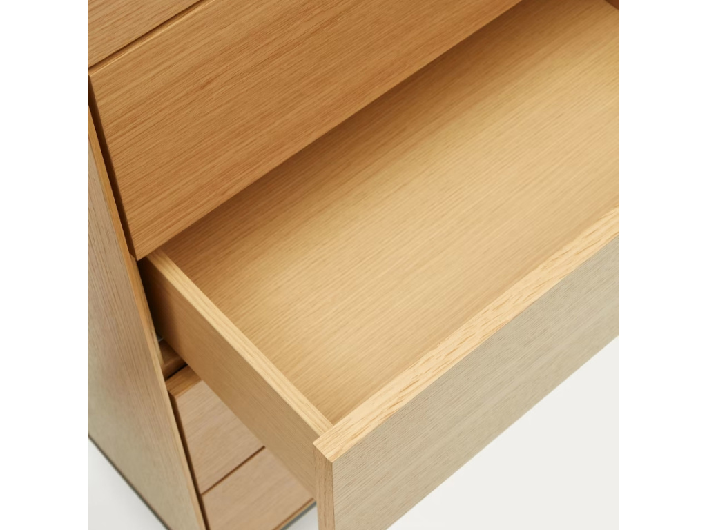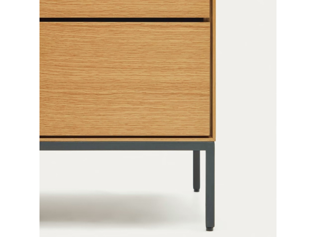 Vysoká komoda Vedrana pochází ze stejnojmenné série nábytku vytvořeného týmem Kave Home. Tyto úložné prostory jsou velice praktické a skvěle se hodí do industriálních i minimalistických interiérů. Spojení dubové dýhy a vyšší kovové podnože je nejen nadčasové, ale hlavně velice atraktivní. Tato komoda s vyšší podnoží nabízí úložný prostor v podobě pěti prostorných zásuvek. Ty se budou skvěle hodit například ke zorganizování oblečení a spodního prádla Sjednoťte úložné prostory ve vaší domácnosti a vpusťte do ní sérii Vedrana! Vybírat můžete z komod a TV stolků různých velikostí, všechny jsou dostupné v provedení dub i ořech.