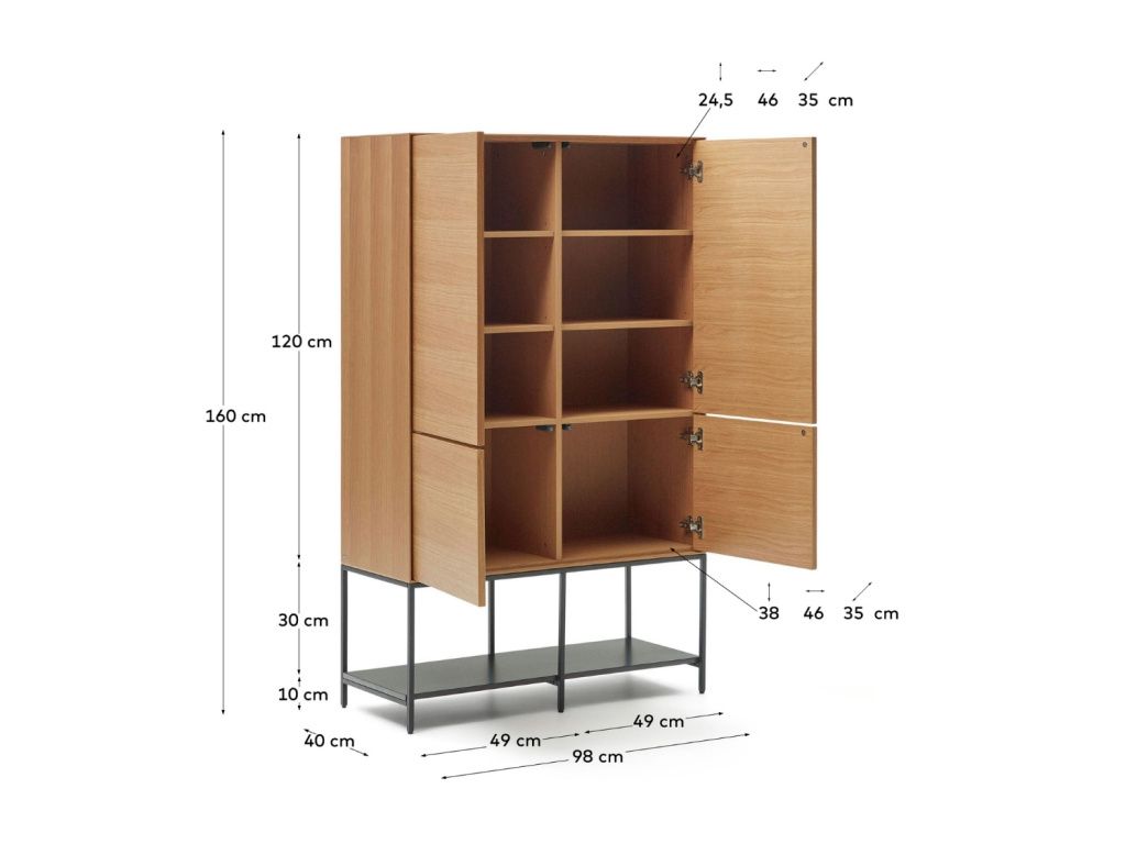 Vysoká komoda Vedrana pochází ze stejnojmenné série nábytku vytvořeného týmem Kave Home. Tyto úložné prostory jsou velice praktické a skvěle se hodí do industriálních i minimalistických interiérů. Spojení dubové dýhy a vyšší kovové podnože je nejen nadčasové, ale hlavně velice atraktivní. Tato komoda s vyšší podnoží nabízí kromě osmi uzavřených polic také jednu otevřenou polici, kterou můžete využít třeba na knihy, časopisy a katalogy. Sjednoťte úložné prostory ve vaší domácnosti a vpusťte do ní sérii Vedrana! Vybírat můžete z komod a TV stolků různých velikostí, všechny jsou dostupné v provedení dub i ořech.