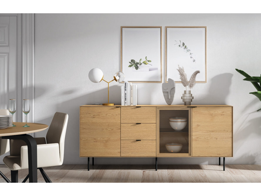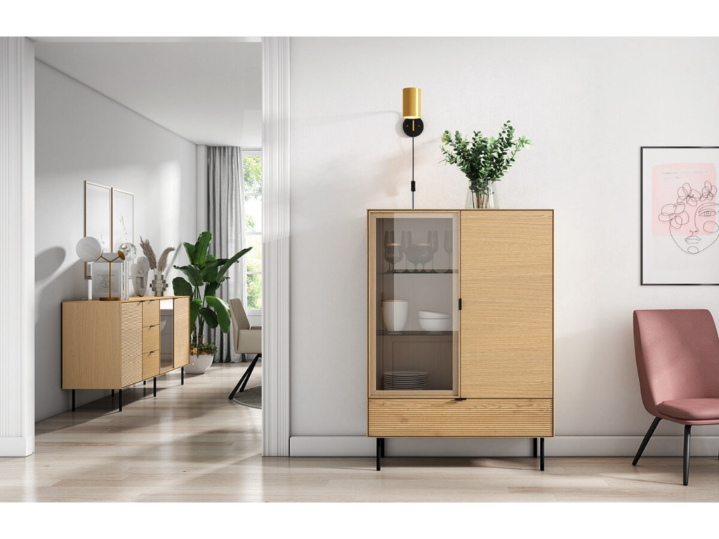 Komoda Tulsa od španělské značky Somcasa je vyrobena z dubové dýhy a dubového masivu, z něhož jsou dvířka a zásuvky. Pyšní se jednoduchým funkčním designem ve skandinávském stylu a kombinuje oblíbené materiály, jako jsou dřevo a kov. Spojení přírodních odstínů a černého kovu působí elegantně a vnese do prostoru svěží nádech. Nevšední prvek představuje vroubkovaný povrch dvířek, což celému kousku dodává na originalitě. Komoda nabízí dostatek úložného prostoru například pro vaše oblečení či ložní prádlo. Za prosklená dvířka můžete vystavit své oblíbené dekorace a nemusíte se tak bát nežádoucího prachu. Komoda skvěle zapadne do moderních i industriálních interiérů, kde jí to bude slušet například v ložnici nebo v obývacím pokoji spolu s dalšími doplňky ze stejnojmenné kolekce.