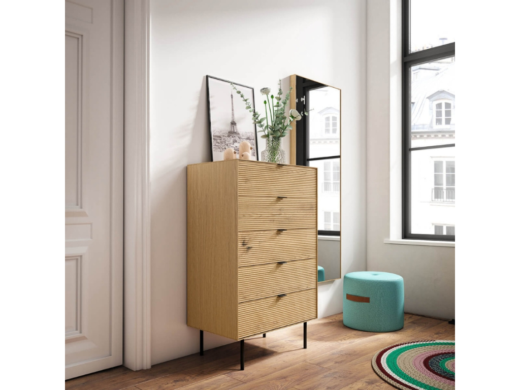 Dubová komoda od španělské značky Somcasa je dalším nadčasovým kouskem v designové sérii TULSA. Komoda se pyšní minimalistickým funkčním designem, který představuje nesmrtelnou kombinaci dřeva a kovu. Korpus je vyroben z dubové dýhy a doplňuje ho pět praktických zásuvek z dubového masivu, které disponují kovovými rukojeťmi a měkkým zavíracím systémem Soft closing. Zásuvky vás potěší dostatečným úložným prostorem, který využijete například na ukládaní oblečení, ložního prádla či různých doplňků. Stabilitu komody zajišťuje lakovaná kovová podnož, jež působí lehkým vzdušným dojmem. Kombinace přírodního dřeva a černého kovu působí elegantně a vnese do prostoru svěží nádech. Komoda se bude skvěle vyjímat v moderních či skandinávských interiérech, kde jí to bude slušet například v ložnici nebo v obývacím pokoji spolu s dalšími doplňky ze stejnojmenné kolekce.