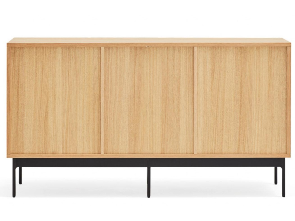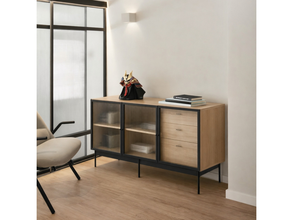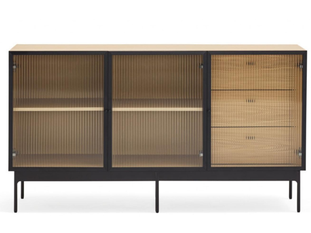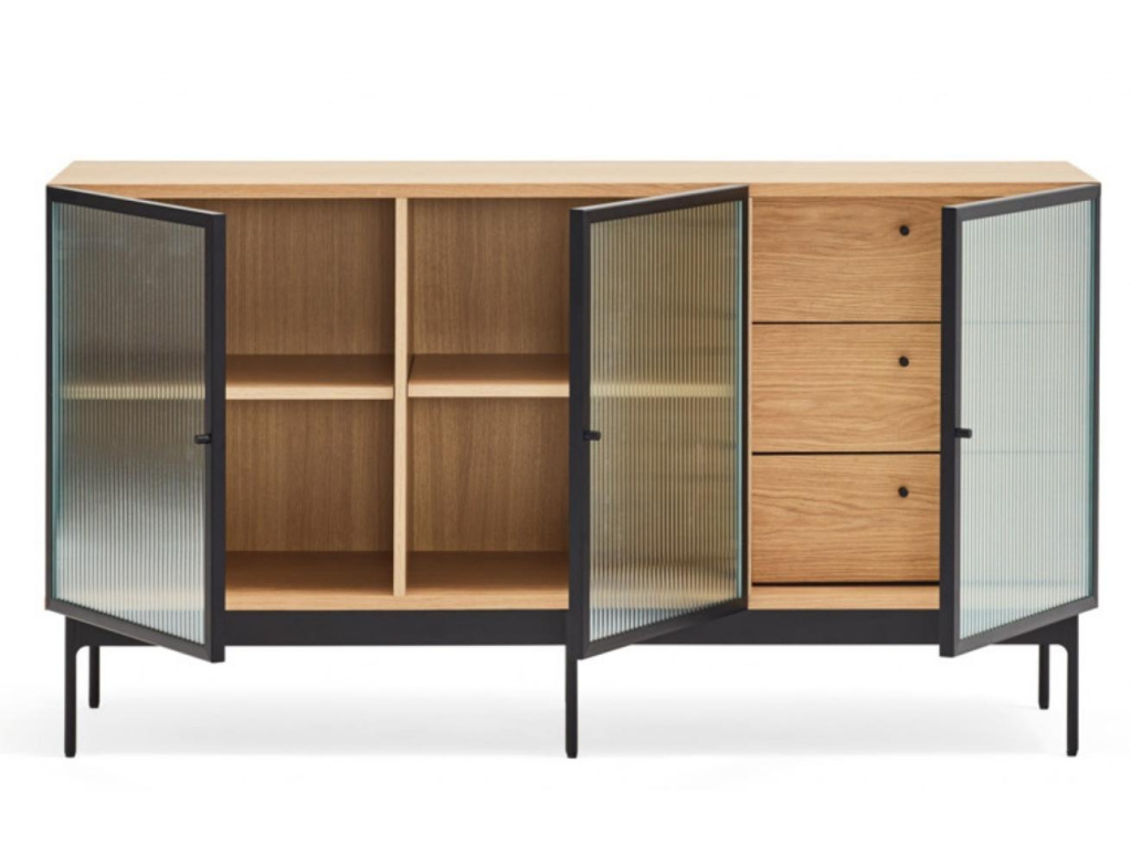 Zajímavá podélná komoda Teulat Blur se rychle stane nepřehlédnutelným designovým prvkem vašeho interiéru. Prostorné police a tři výsuvné zásuvky poskytují dostatečné úložiště pro váš inventář. Osobní kouzlo Teulat Blur spočívá především v prosklených vroubkovaných dvířkách, které komodě dodají na jejím výrazu a osobitosti. Korpus komody je z přírodní dubové dýhy a podnož z černě lakovaného kovu. Komoda se hodí do všech moderně i klasicky zařízených interiérů.